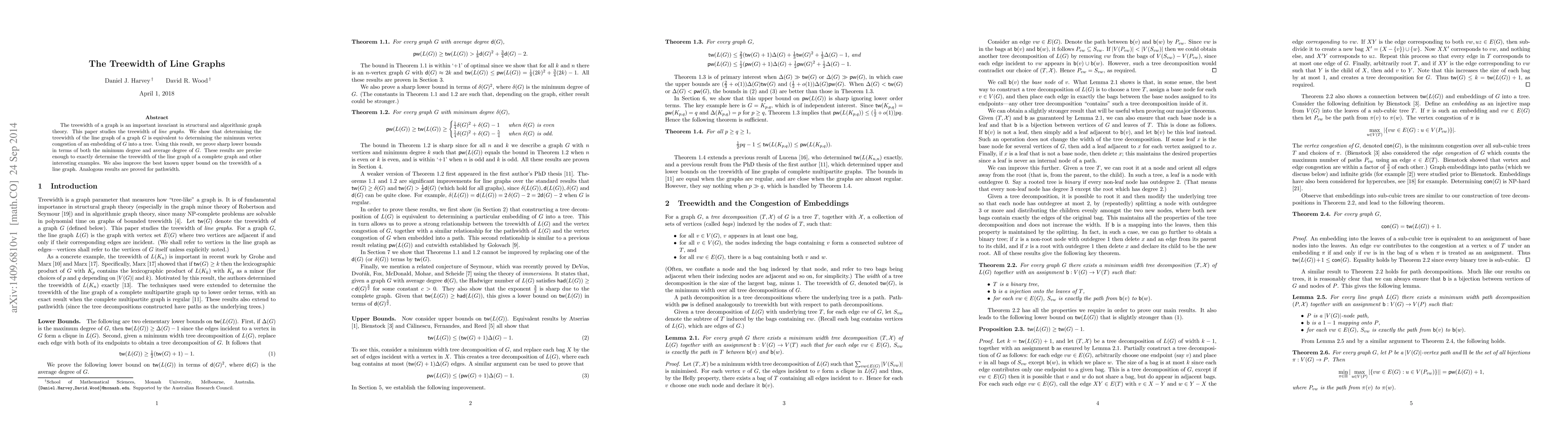This paper investigates the treewidth of line graphs, demonstrating its equivalence to determining the minimum vertex congestion of an embedding of the original graph into a tree. It establishes sharp lower bounds based on the minimum and average degree of the original graph, and improves the upper bound on the treewidth of a line graph.