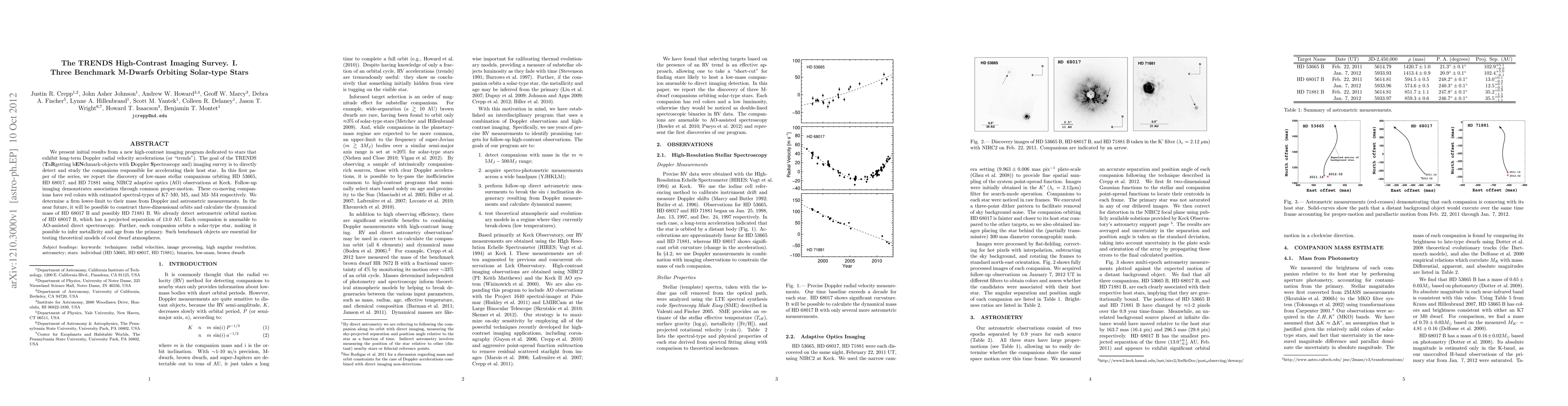 We present initial results from a new high-contrast imaging program dedicated to stars that exhibit long-term Doppler radial velocity accelerations (or "trends"). The goal of the TRENDS (TaRgetting bENchmark-objects with Doppler Spectroscopy and) imaging survey is to directly detect and study the companions responsible for accelerating their host star. In this first paper of the series, we report the discovery of low-mass stellar companions orbiting HD 53665, HD 68017, and HD 71881 using NIRC2 adaptive optics (AO) observations at Keck. Follow-up imaging demonstrates association through common proper-motion. These co-moving companions have red colors with estimated spectral-types of K7--M0, M5, and M3--M4 respectively. We determine a firm lower-limit to their mass from Doppler and astrometric measurements. In the near future, it will be possible to construct three-dimensional orbits and calculate the dynamical mass of HD 68017 B and possibly HD 71881 B. We already detect astrometric orbital motion of HD 68017 B, which has a projected separation of 13.0 AU. Each companion is amenable to AO-assisted direct spectroscopy. Further, each companion orbits a solar-type star, making it possible to infer metallicity and age from the primary. Such benchmark objects are essential for testing theoretical models of cool dwarf atmospheres.