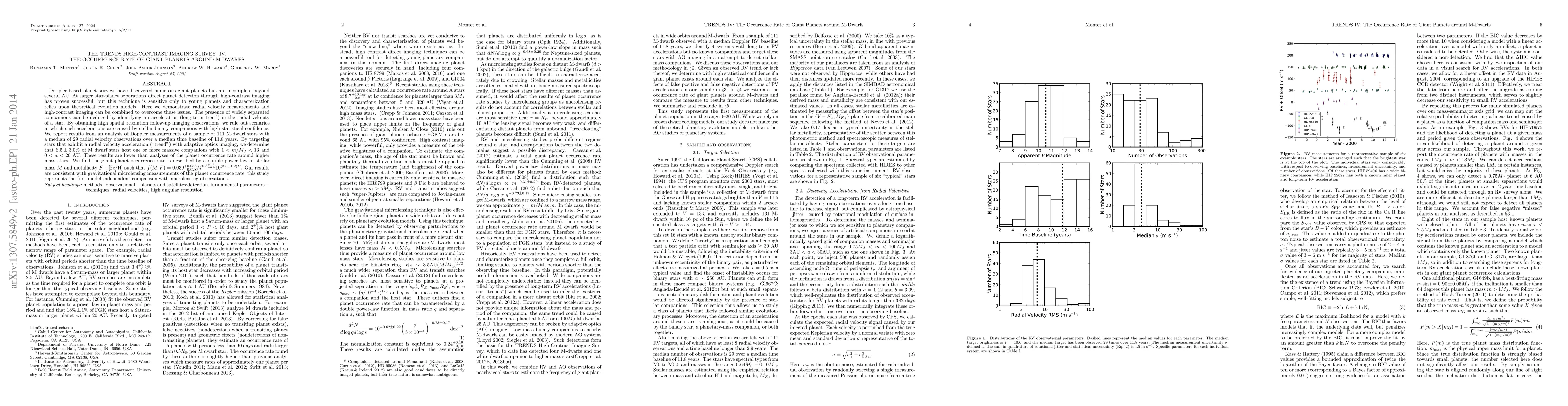 This study combines radial velocity measurements and high-contrast imaging to determine the occurrence rate of giant planets around M-dwarf stars, finding that 6.5% +/- 3.0% host massive companions. The planet occurrence rate correlates with stellar mass and metallicity, providing a model-independent comparison with gravitational microlensing observations.
