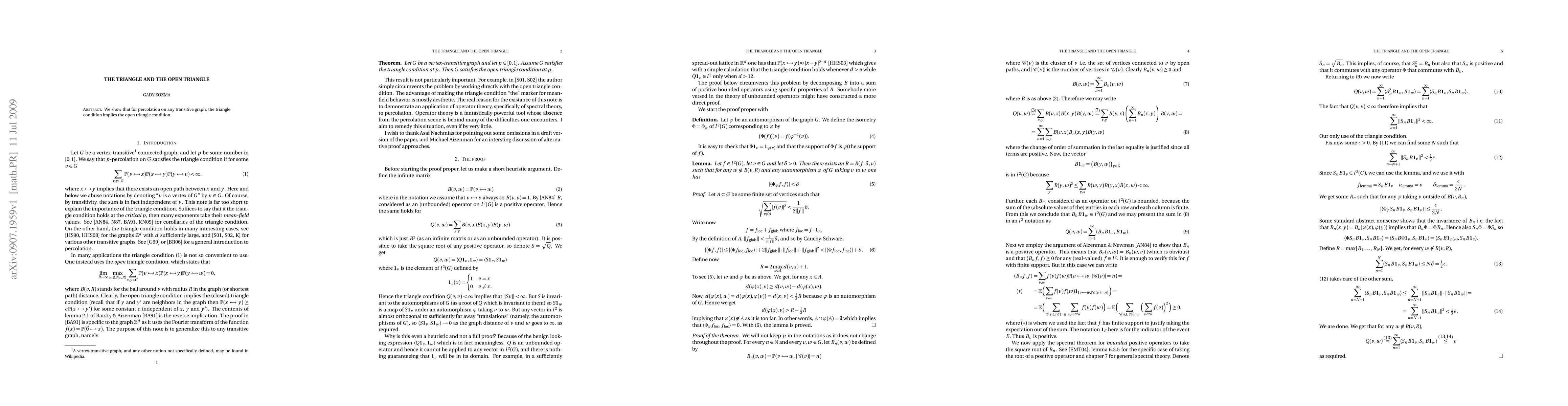 We show that for percolation on any transitive graph, the triangle condition implies the open triangle condition.