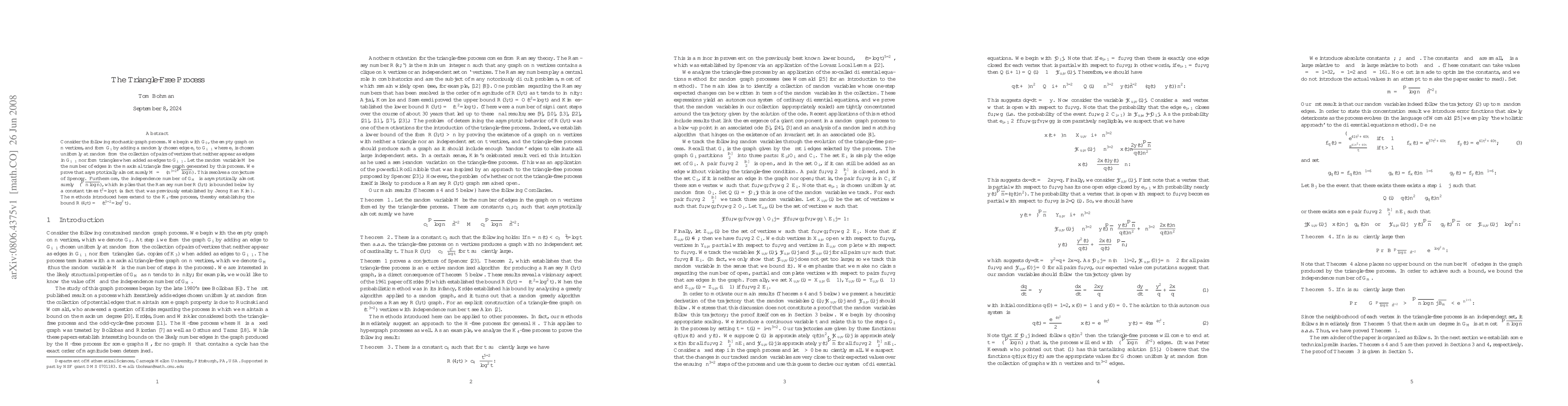 This paper analyzes a stochastic graph process that constructs a maximal triangle-free graph by adding edges randomly while avoiding triangles. It determines the likely order of edges in the final graph and proves that this process likely produces a Ramsey R(3,t) graph, improving the lower bound on R(3,t). The techniques also extend to the K_4-free process, improving the lower bound on R(4,t).