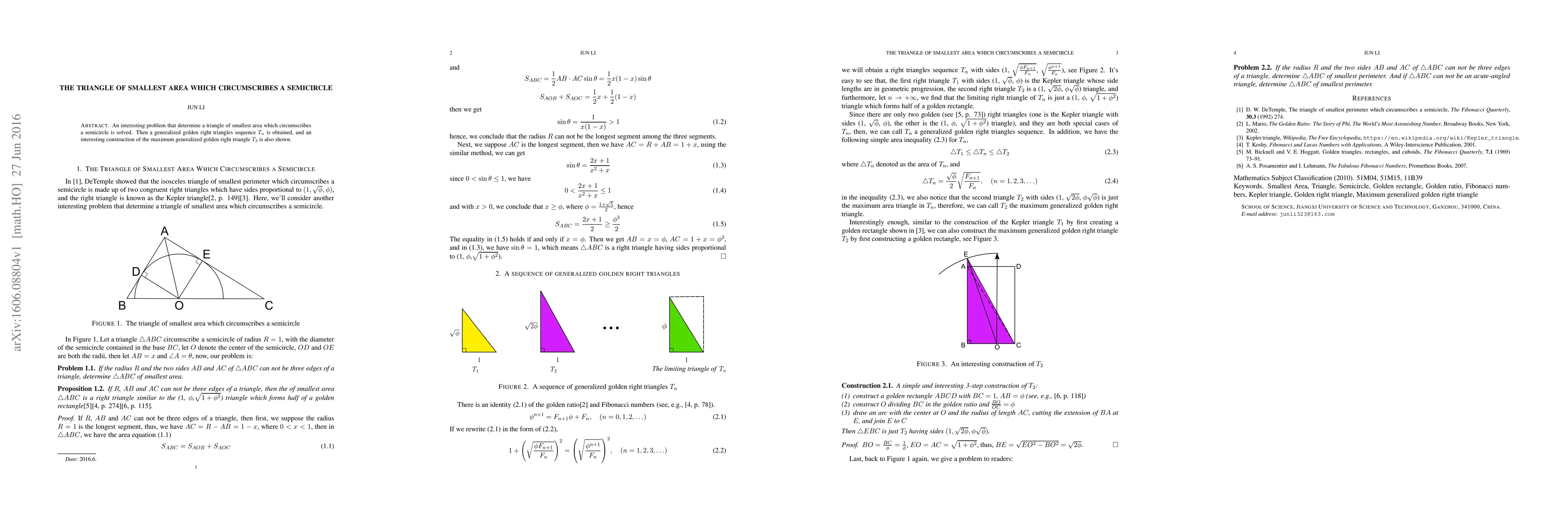 This paper solves the problem of finding the triangle of smallest area that circumscribes a semicircle, deriving a generalized golden right triangles sequence $T_n$ and demonstrating the construction of the maximum generalized golden right triangle $T_2$.