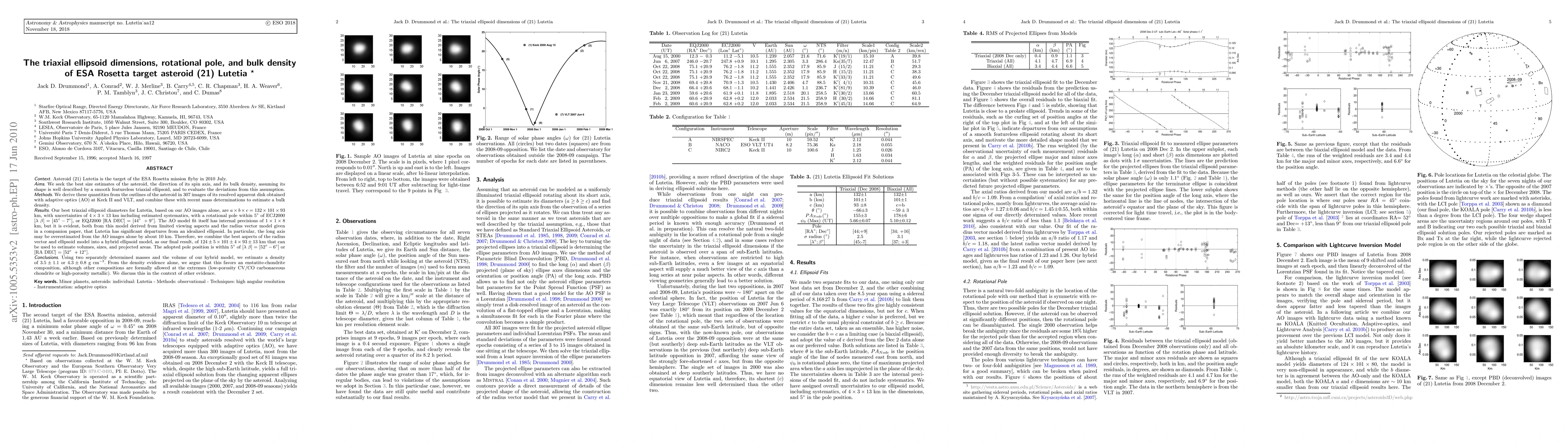 We seek the best size estimates of the asteroid (21) Lutetia, the direction of its spin axis, and its bulk density, assuming its shape is well described by a smooth featureless triaxial ellipsoid, and to evaluate the deviations from this assumption. Methods. We derive these quantities from the outlines of the asteroid in 307 images of its resolved apparent disk obtained with adaptive optics (AO) at Keck II and VLT, and combine these with recent mass determinations to estimate a bulk density. Our best triaxial ellipsoid diameters for Lutetia, based on our AO images alone, are a x b x c = 132 x 101 x 93 km, with uncertainties of 4 x 3 x 13 km including estimated systematics, with a rotational pole within 5 deg. of ECJ2000 [long,lat] = [45, -7], or EQJ2000 [RA, DEC] = [44, +9]. The AO model fit itself has internal precisions of 1 x 1 x 8 km, but it is evident, both from this model derived from limited viewing aspects and the radius vector model given in a companion paper, that Lutetia has significant departures from an idealized ellipsoid. In particular, the long axis may be overestimated from the AO images alone by about 10 km. Therefore, we combine the best aspects of the radius vector and ellipsoid model into a hybrid ellipsoid model, as our final result, of 124 +/- 5 x 101 +/- 4 x 93 +/- 13 km that can be used to estimate volumes, sizes, and projected areas. The adopted pole position is within 5 deg. of [long, lat] = [52, -6] or[RA DEC] = [52, +12]. Using two separately determined masses and the volume of our hybrid model, we estimate a density of 3.5 +/- 1.1 or 4.3 +/- 0.8 g cm-3 . From the density evidence alone, we argue that this favors an enstatite-chondrite composition, although other compositions are formally allowed at the extremes (low-porosity CV/CO carbonaceous chondrite or high-porosity metallic). We discuss this in the context of other evidence.