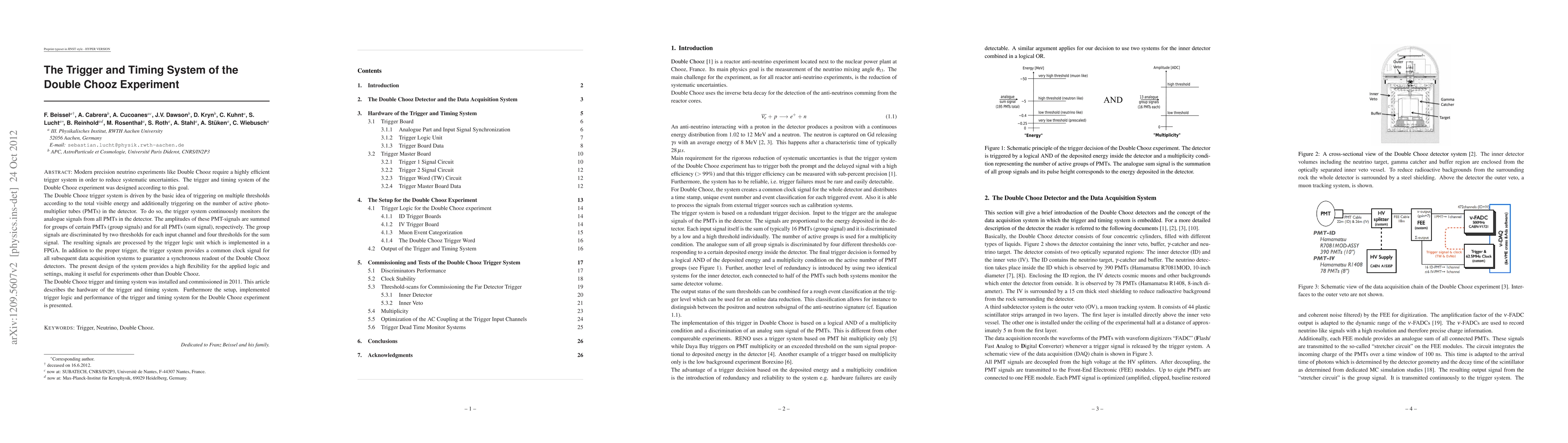The Double Chooz experiment employs a sophisticated trigger and timing system to minimize systematic uncertainties by monitoring PMT signals and triggering based on energy thresholds and PMT activity. The system, implemented in an FPGA, ensures synchronous data acquisition and has been operational since 2011.