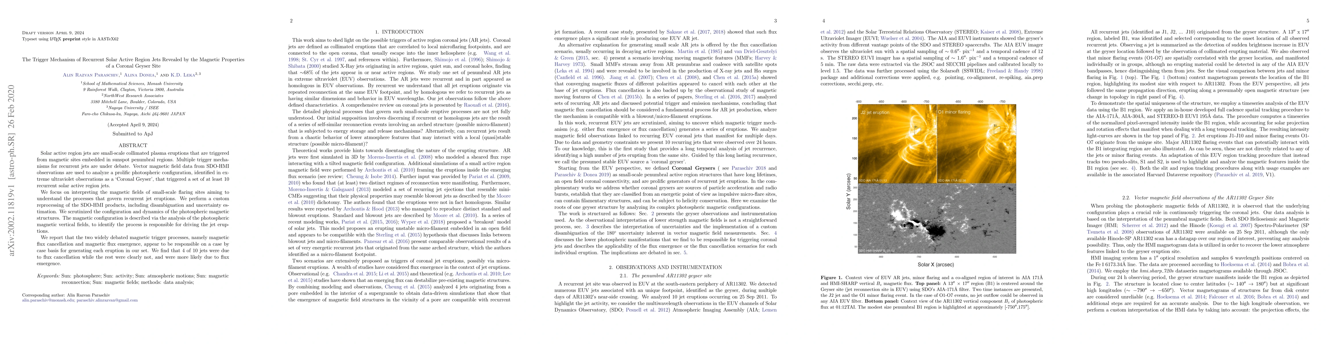 This study investigates the magnetic properties of a Coronal Geyser site to reveal the trigger mechanisms for recurrent solar active region jets. Analysis of SDO-HMI vector magnetic field data shows that both magnetic flux cancellation and emergence can trigger these jets, with 4 out of 10 jets linked to flux cancellation and the rest likely due to flux emergence.