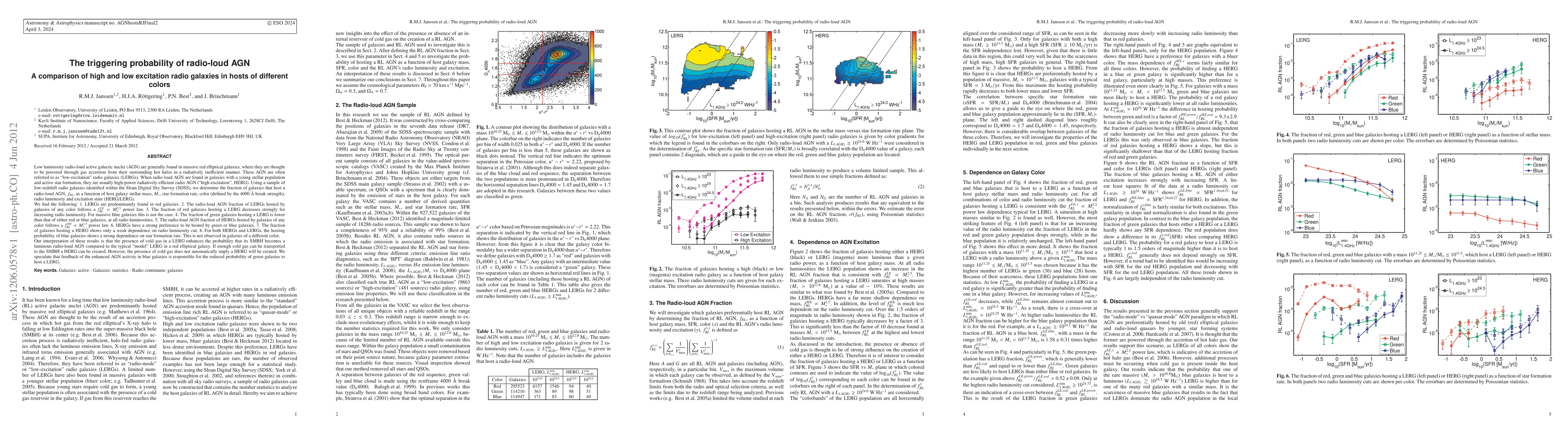 This study investigates the triggering probability of radio-loud AGN in galaxies of different colors, finding that low-excitation radio galaxies (LERGs) predominantly reside in red galaxies, while high-excitation radio galaxies (HERGs) favor green or blue galaxies. The research concludes that LERGs follow a $f^{LE}_{RL} \propto M^{2.5}_*$ trend, whereas HERGs follow a $f^{HE}_{RL} \propto M^{1.5}_*$ trend, with a notable preference for star-forming blue galaxies.