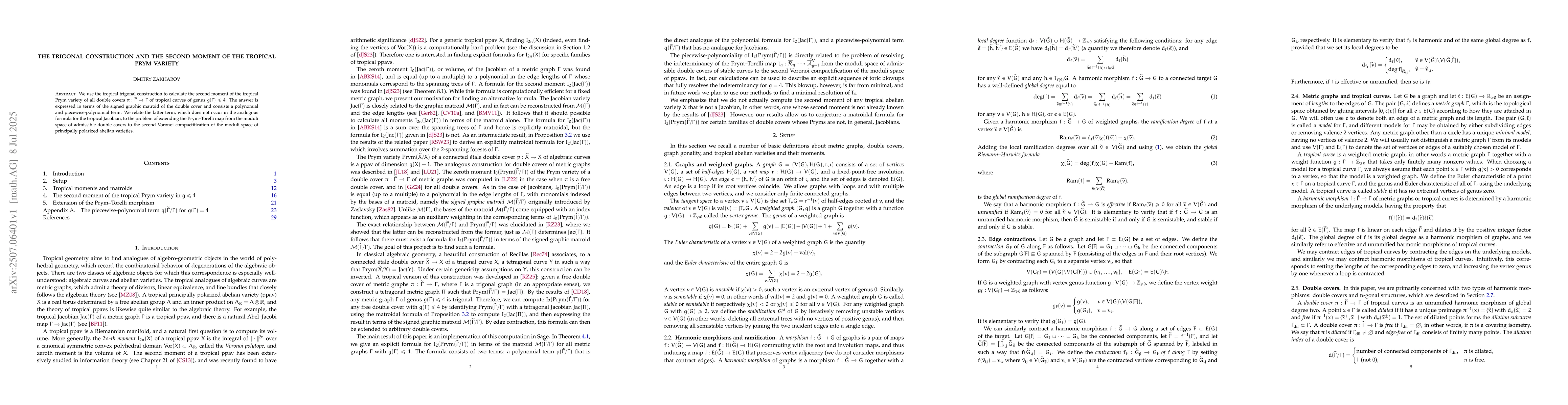We use the tropical trigonal construction to calculate the second moment of the tropical Prym variety of all double covers $\pi:\widetilde{\Gamma}\to \Gamma$ of tropical curves of genus $g(\Gamma)\leq 4$. The answer is expressed in terms of the signed graphic matroid of the double cover and consists a polynomial and piecewise-polynomial term. We relate the latter term, which does not occur in the analogous formula for the tropical Jacobian, to the problem of extending the Prym--Torelli map from the moduli space of admissible double covers to the second Voronoi compactification of the moduli space of principally polarized abelian varieties.