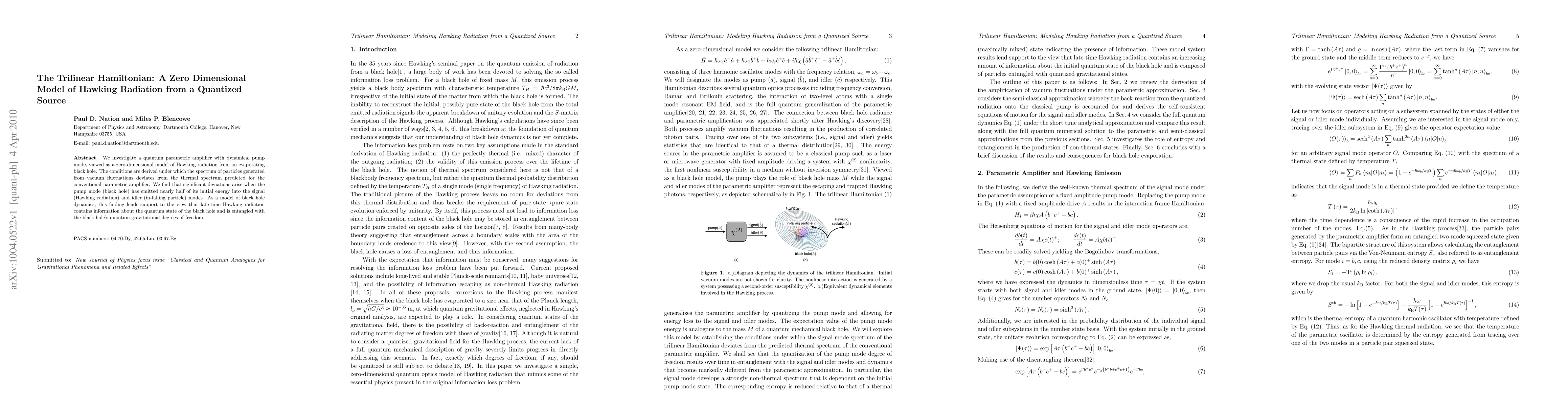 We investigate a quantum parametric amplifier with dynamical pump mode, viewed as a zero-dimensional model of Hawking radiation from an evaporating black hole. The conditions are derived under which the spectrum of particles generated from vacuum fluctuations deviates from the thermal spectrum predicted for the conventional parametric amplifier. We find that significant deviations arise when the pump mode (black hole) has emitted nearly half of its initial energy into the signal (Hawking radiation) and idler (in-falling particle) modes. As a model of black hole dynamics, this finding lends support to the view that late-time Hawking radiation contains information about the quantum state of the black hole and is entangled with the black hole's quantum gravitational degrees of freedom.