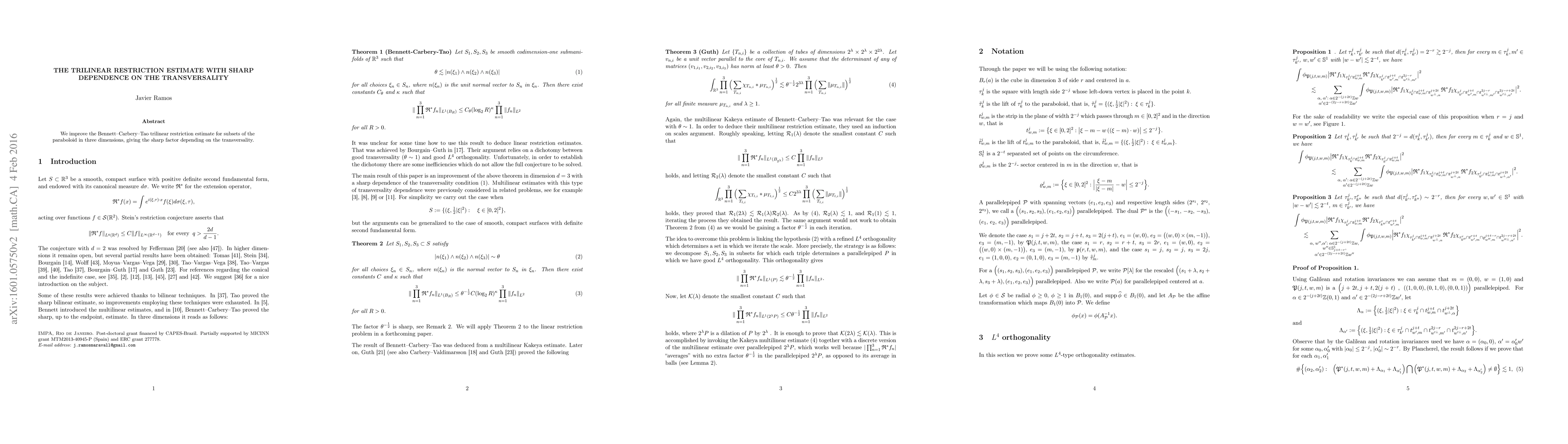 Researchers improved a trilinear restriction estimate for subsets of the paraboloid in three dimensions, achieving a sharp factor dependent on transversality.