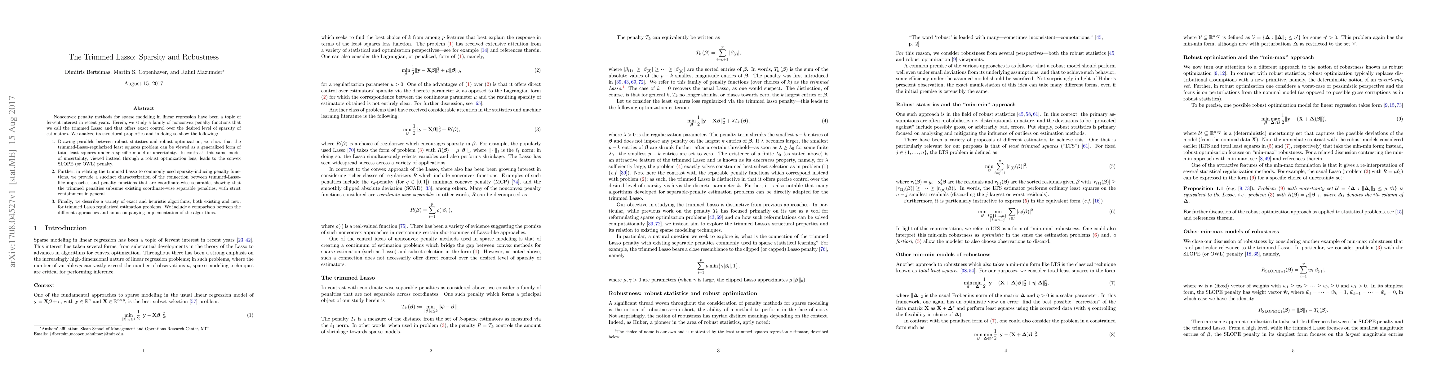 Nonconvex penalty methods for sparse modeling in linear regression have been a topic of fervent interest in recent years. Herein, we study a family of nonconvex penalty functions that we call the trimmed Lasso and that offers exact control over the desired level of sparsity of estimators. We analyze its structural properties and in doing so show the following: 1) Drawing parallels between robust statistics and robust optimization, we show that the trimmed-Lasso-regularized least squares problem can be viewed as a generalized form of total least squares under a specific model of uncertainty. In contrast, this same model of uncertainty, viewed instead through a robust optimization lens, leads to the convex SLOPE (or OWL) penalty. 2) Further, in relating the trimmed Lasso to commonly used sparsity-inducing penalty functions, we provide a succinct characterization of the connection between trimmed-Lasso- like approaches and penalty functions that are coordinate-wise separable, showing that the trimmed penalties subsume existing coordinate-wise separable penalties, with strict containment in general. 3) Finally, we describe a variety of exact and heuristic algorithms, both existing and new, for trimmed Lasso regularized estimation problems. We include a comparison between the different approaches and an accompanying implementation of the algorithms.