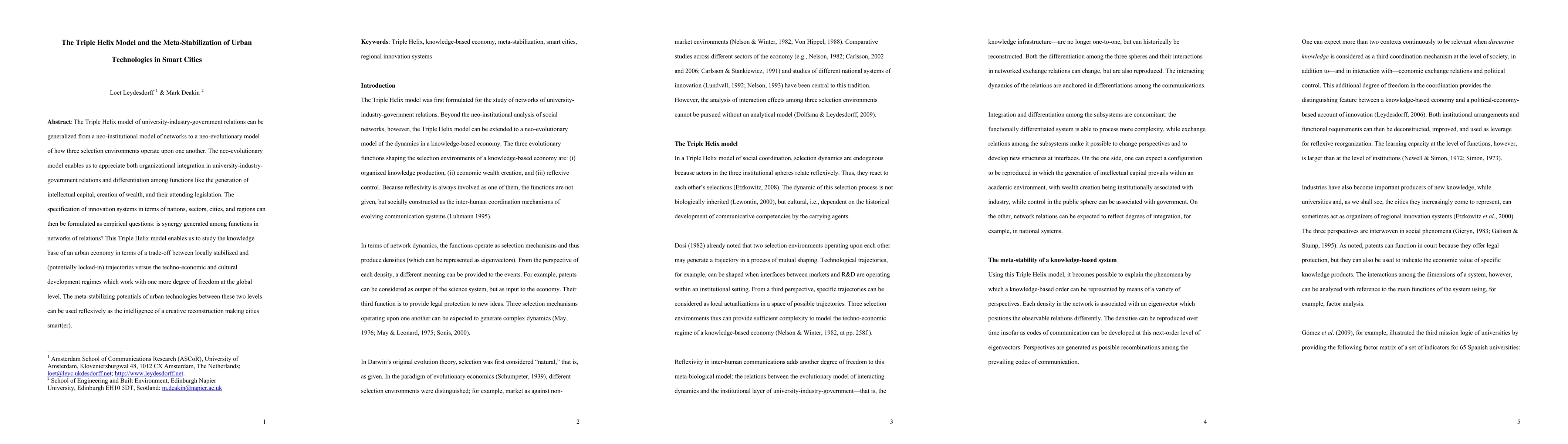 This paper generalizes the Triple Helix model to a neo-evolutionary framework, exploring how university-industry-government relations influence urban technologies in smart cities. It examines the meta-stabilization potentials of urban technologies, balancing local and global development trajectories to enhance urban innovation systems.
