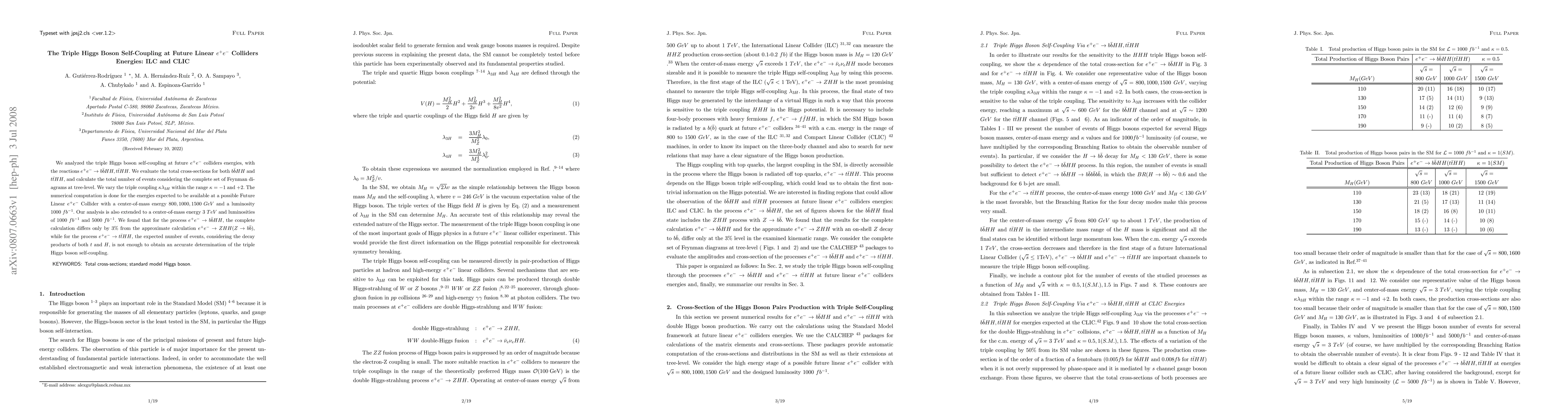 This paper investigates the triple Higgs boson self-coupling at future linear $e^{+}e^{-}$ colliders, specifically for energies of ILC and CLIC. The study evaluates total cross-sections for $b\bar bHH$ and $t\bar tHH$ processes, finding that the complete calculation for $b\bar bHH$ differs only slightly from an approximate method, while $t\bar tHH$ lacks sufficient events for precise coupling determination.