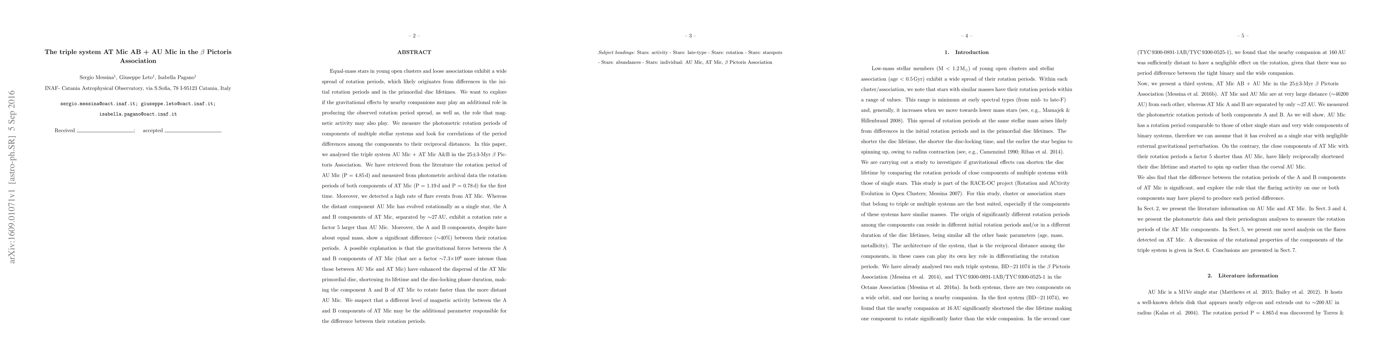 Equal-mass stars in young open clusters and loose associations exhibit a wide spread of rotation periods, which likely originates from differences in the initial rotation periods and in the primordial disc lifetimes. We want to explore if the gravitational effects by nearby companions may play an additional role in producing the observed rotation period spread. We measure the photometric rotation periods of components of multiple stellar systems and look for correlations of the period differences among the components to their reciprocal distances. In this paper, we analysed the triple system AU Mic + AT Mic A&B in the 25-Myr beta Pictoris Association. We have retrieved from the literature the rotation period of AU Mic (P = 4.85d) and measured from photometric archival data the rotation periods of both components of AT Mic (P = 1.19d and P = 0.78d) for the first time. Moreover, we detected a high rate of flare events from AT Mic. Whereas the distant component AU Mic has evolved rotationally as a single star, the A and B components of AT Mic, separated by about 27 AU, exhibit a rotation rate a factor 5 larger than AU Mic. Moreover, the A and B components, despite have about equal mass, show a significant difference (about 40%) between their rotation periods. A possible explanation is that the gravitational forces between the A and B components of AT Mic (that are a factor about 7.3 x 10^6 more intense than those between AU Mic and AT Mic) have enhanced the dispersal of the AT Mic primordial disc, shortening its lifetime and the disc-locking phase duration, making the component A and B of AT Mic to rotate faster than the more distant AU Mic. We suspect that a different level of magnetic activity between the A and B components of AT Mic may be the additional parameter responsible for the difference between their rotation periods.
