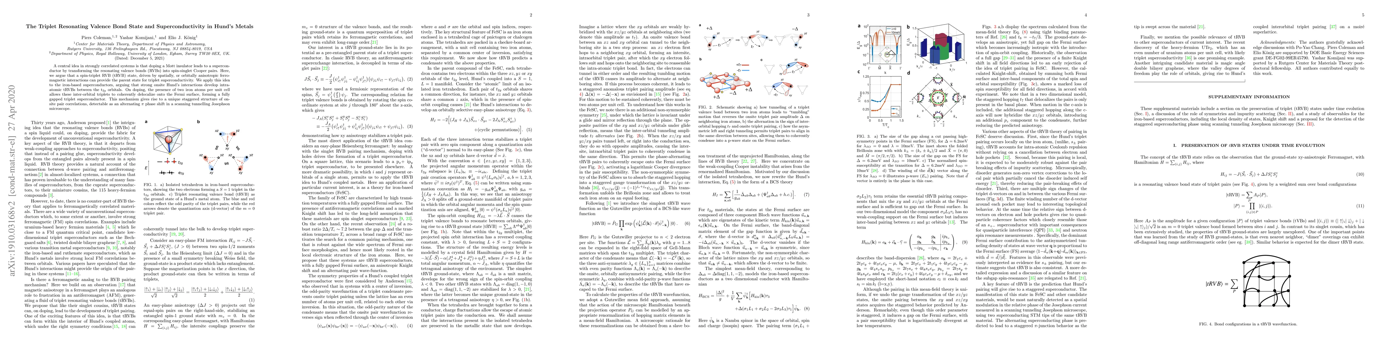 This paper proposes that a spin-triplet resonating valence bond (tRVB) state driven by anisotropic ferromagnetic interactions can serve as the parent state for triplet superconductivity in Hund's metals. It applies this concept to iron-based superconductors, suggesting that strong onsite Hund's interactions create tRVBs between t$_{2g}$ orbitals, which upon doping, delocalize to form a coherent triplet superconductor.