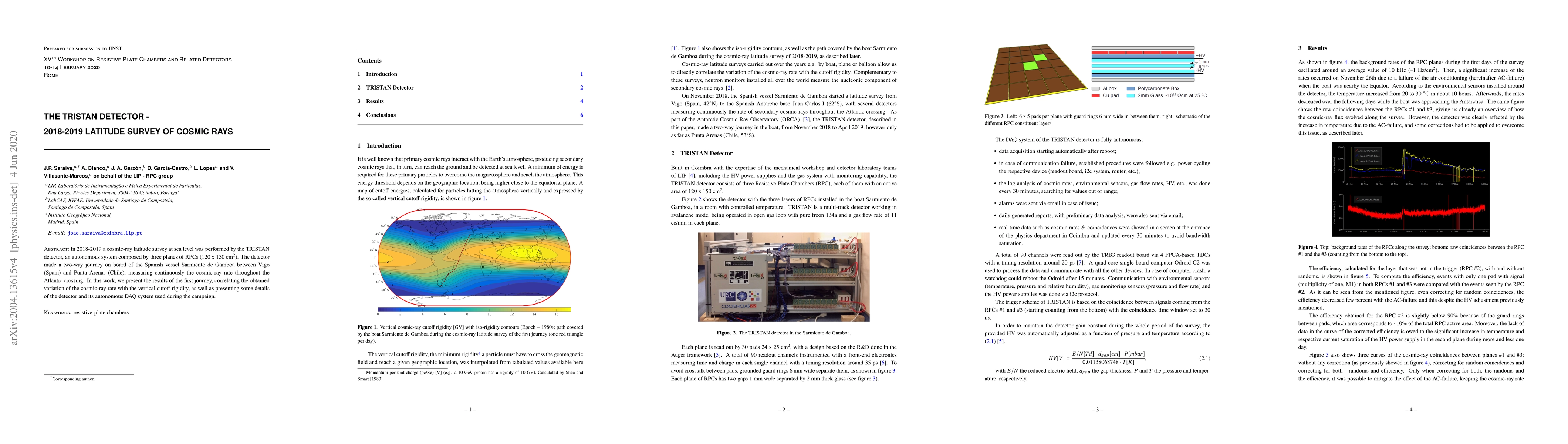 In 2018-2019 a cosmic-ray latitude survey at sea level was performed by the TRISTAN detector, an autonomous system composed by three planes of RPCs (120 x 150 cm$^{2}$). The detector made a two-way journey on board of the Spanish vessel Sarmiento de Gamboa between Vigo (Spain) and Punta Arenas (Chile), measuring continuously the cosmic-ray rate throughout the Atlantic crossing. In this work, we present the results of the first journey, correlating the obtained variation of the cosmic-ray rate with the vertical cutoff rigidity, as well as presenting some details of the detector and its autonomous DAQ system used during the campaign.