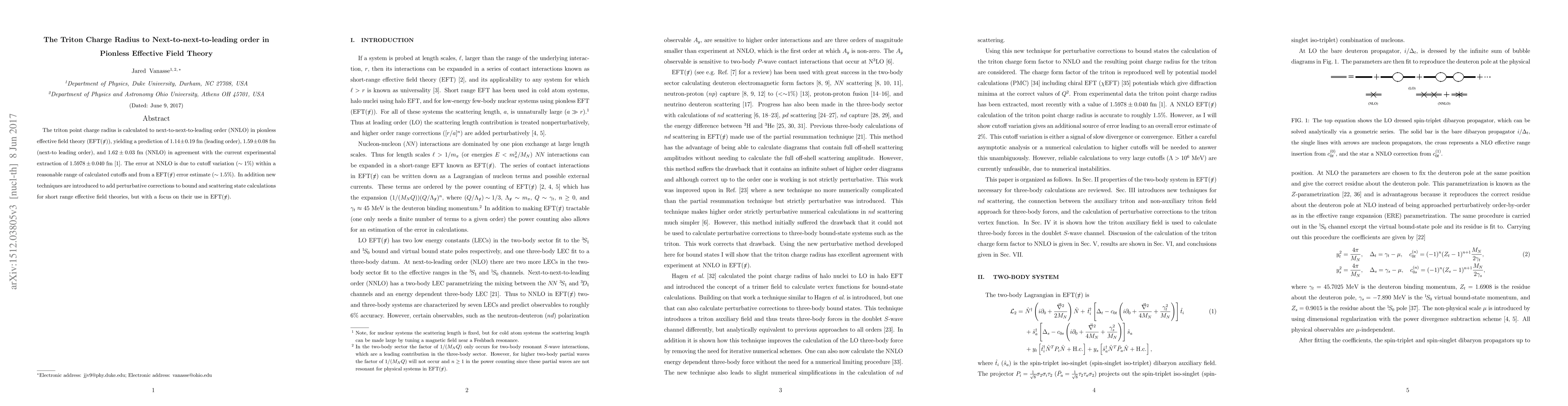 This paper calculates the triton charge radius to next-to-next-to-leading order in pionless effective field theory, yielding predictions of 1.62±0.03 fm, which aligns with the experimental value of 1.5978±0.040 fm. The study introduces new techniques for perturbative corrections in short-range effective field theories, particularly within pionless EFT.