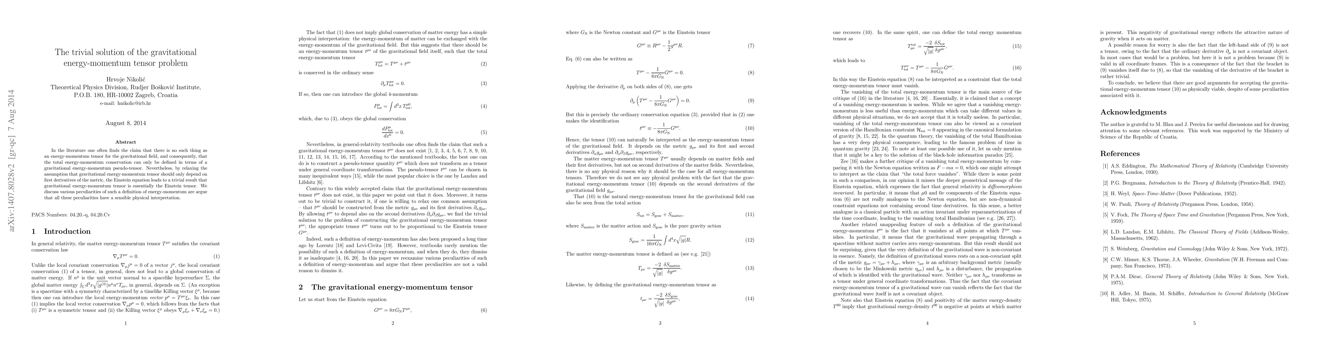 This paper argues that the gravitational energy-momentum tensor can be defined as the Einstein tensor, derived from relaxing the assumption that it should only depend on first derivatives of the metric. It discusses the physical implications of this definition, asserting that all associated peculiarities have meaningful interpretations.