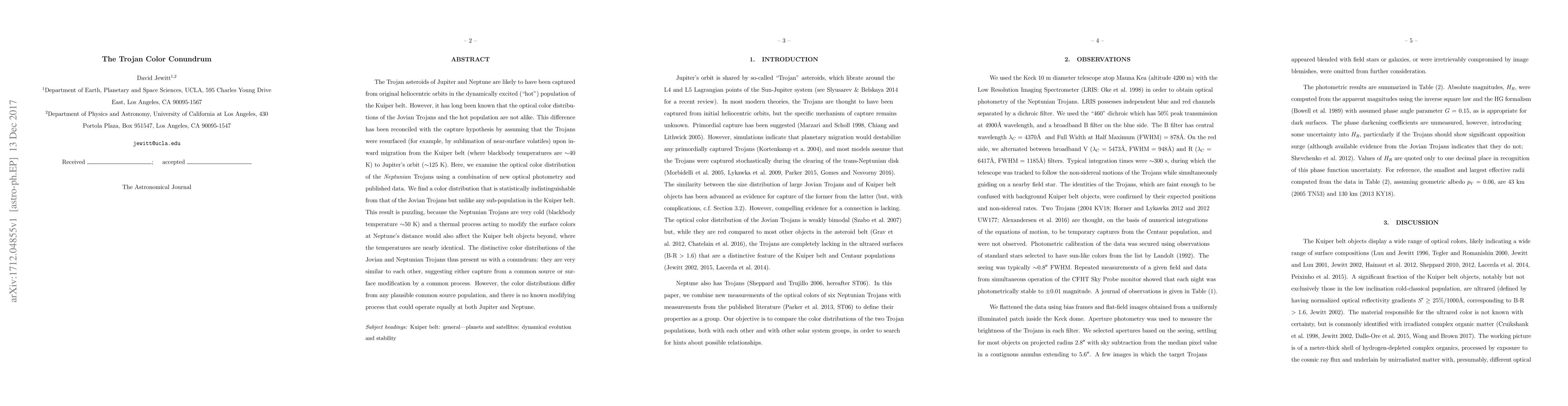 The Trojan asteroids of Jupiter and Neptune are likely to have been captured from original heliocentric orbits in the dynamically excited ("hot") population of the Kuiper belt. However, it has long been known that the optical color distributions of the Jovian Trojans and the hot population are not alike. This difference has been reconciled with the capture hypothesis by assuming that the Trojans were resurfaced (for example, by sublimation of near-surface volatiles) upon inward migration from the Kuiper belt (where blackbody temperatures are $\sim$40 K) to Jupiter's orbit ($\sim$125 K). Here, we examine the optical color distribution of the \textit{Neptunian} Trojans using a combination of new optical photometry and published data. We find a color distribution that is statistically indistinguishable from that of the Jovian Trojans but unlike any sub-population in the Kuiper belt. This result is puzzling, because the Neptunian Trojans are very cold (blackbody temperature $\sim$50 K) and a thermal process acting to modify the surface colors at Neptune's distance would also affect the Kuiper belt objects beyond, where the temperatures are nearly identical. The distinctive color distributions of the Jovian and Neptunian Trojans thus present us with a conundrum: they are very similar to each other, suggesting either capture from a common source or surface modification by a common process. However, the color distributions differ from any plausible common source population, and there is no known modifying process that could operate equally at both Jupiter and Neptune.