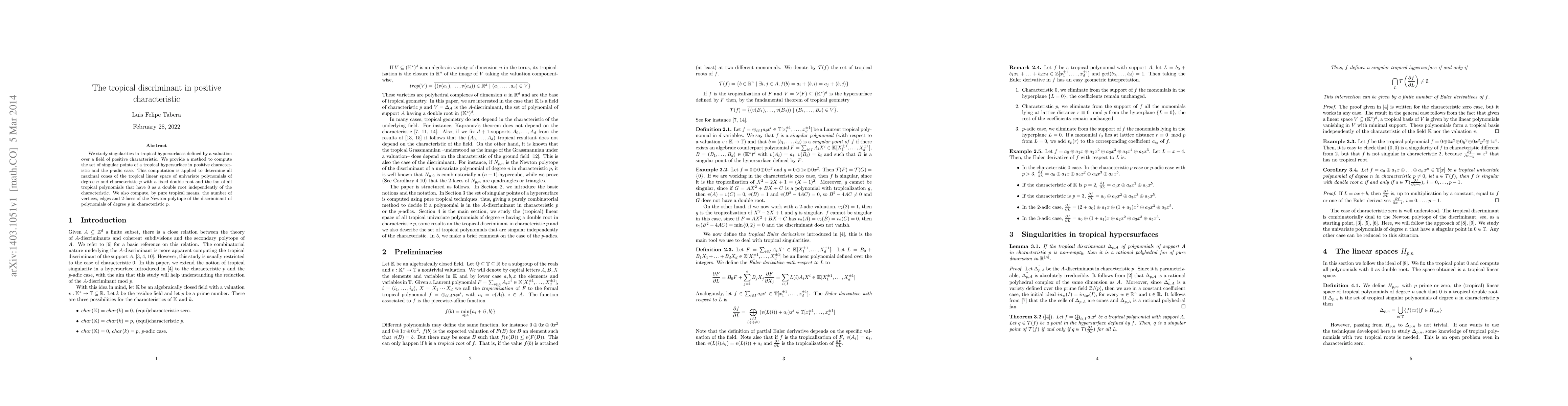 This paper develops a method to compute singular points in tropical hypersurfaces over fields of positive characteristic, applying it to determine maximal cones in tropical linear spaces and the fan of tropical polynomials with double roots. It also calculates the number of vertices, edges, and 2-faces in the Newton polytope of the discriminant for polynomials of degree $p$ in characteristic $p$.