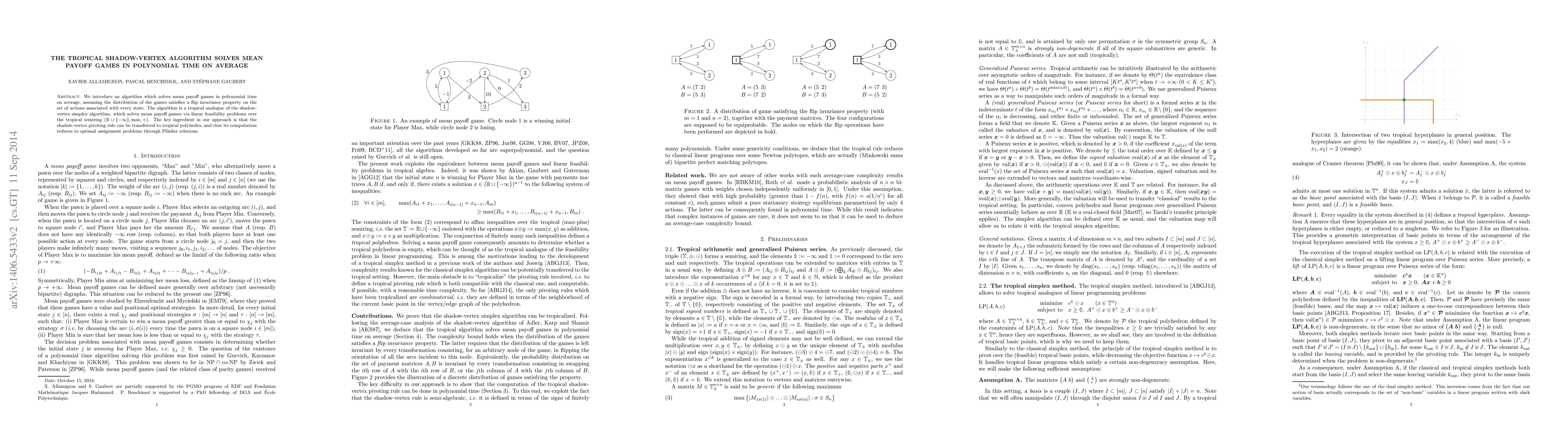 This paper introduces a tropical shadow-vertex algorithm that solves mean payoff games in polynomial time on average, leveraging a flip invariance property. The algorithm uses tropical geometry and optimal assignment problems via Plücker relations to achieve its efficiency.