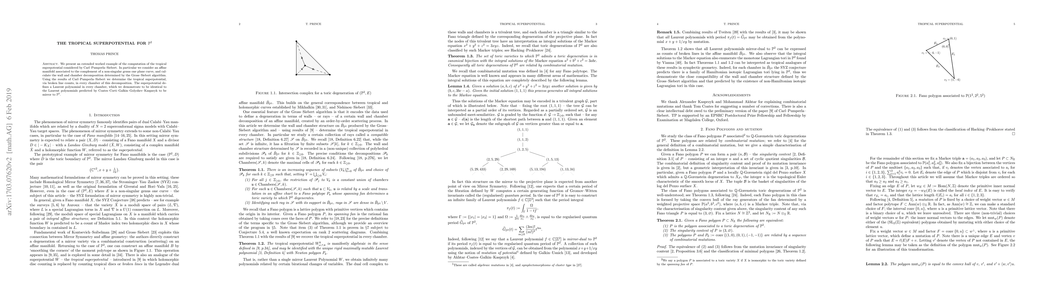 This paper computes the tropical superpotential for $\mathbb{P}^2$ using the Gross--Siebert algorithm, determining its wall and chamber decomposition. It shows that the resulting Laurent polynomials in each chamber correspond to those predicted by Coates--Corti--Galkin--Golyshev--Kaspzryk for the mirror $\mathbb{P}^2$.