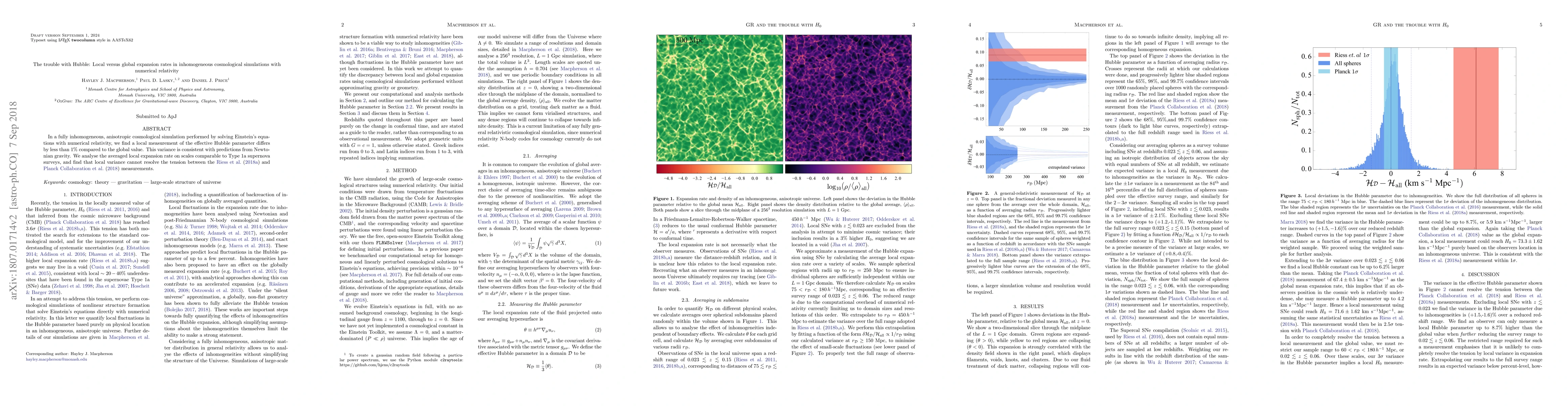 In a fully inhomogeneous, anisotropic cosmological simulation performed by solving Einstein's equations with numerical relativity, we find a local measurement of the effective Hubble parameter differs by less than 1\% compared to the global value. This variance is consistent with predictions from Newtonian gravity. We analyse the averaged local expansion rate on scales comparable to Type 1a supernova surveys, and find that local variance cannot resolve the tension between the \citet{riess2018b} and \citet{planck2018a} measurements.