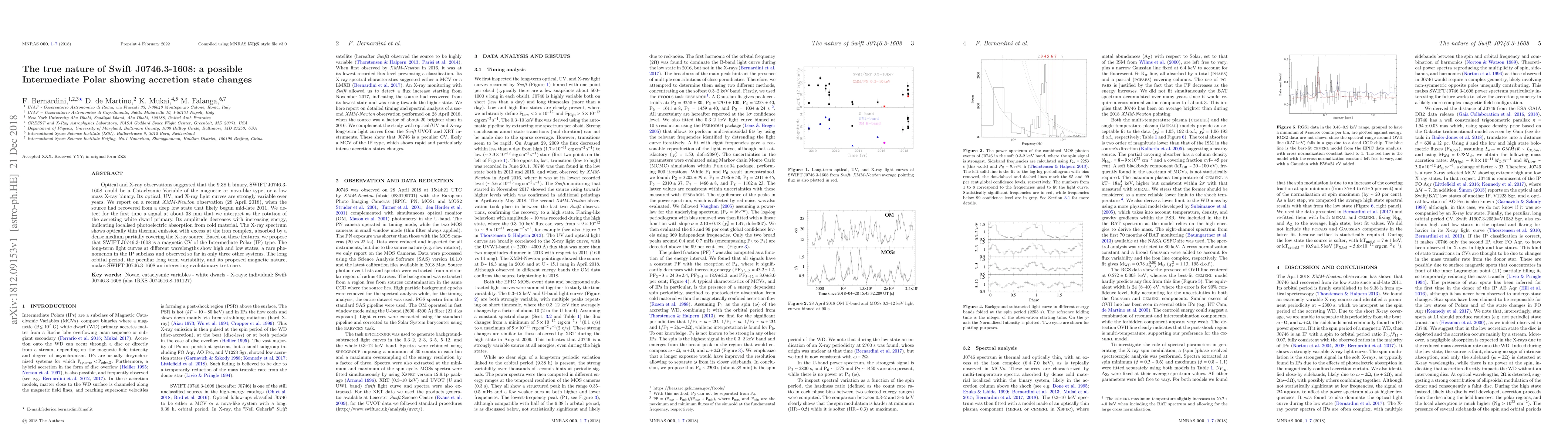 Optical and X-ray observations suggested that the 9.38 h binary, SWIFT J0746.3- 1608 could be a Cataclysmic Variable of the magnetic or nova-like type, or a low mass X-ray binary. Its optical, UV, and X-ray light curves are strongly variable over years. We report on a recent XMM-Newton observation (28 April 2018), when the source had recovered from a deep low state that likely begun mid-late 2011. We detect for the first time a signal at about 38 min that we interpret as the rotation of the accreting white dwarf primary. Its amplitude decreases with increasing energy, indicating localised photoelectric absorption from cold material. The X-ray spectrum shows optically thin thermal emission with excess at the iron complex, absorbed by a dense medium partially covering the X-ray source. Based on these features, we propose that SWIFT J0746.3-1608 is a magnetic CV of the Intermediate Polar (IP) type. The long-term light curves at different wavelengths show high and low states, a rare phenomenon in the IP subclass and observed so far in only three other systems. The long orbital period, the peculiar long term variability, and its proposed magnetic nature, makes SWIFT J0746.3-1608 an interesting evolutionary test case.