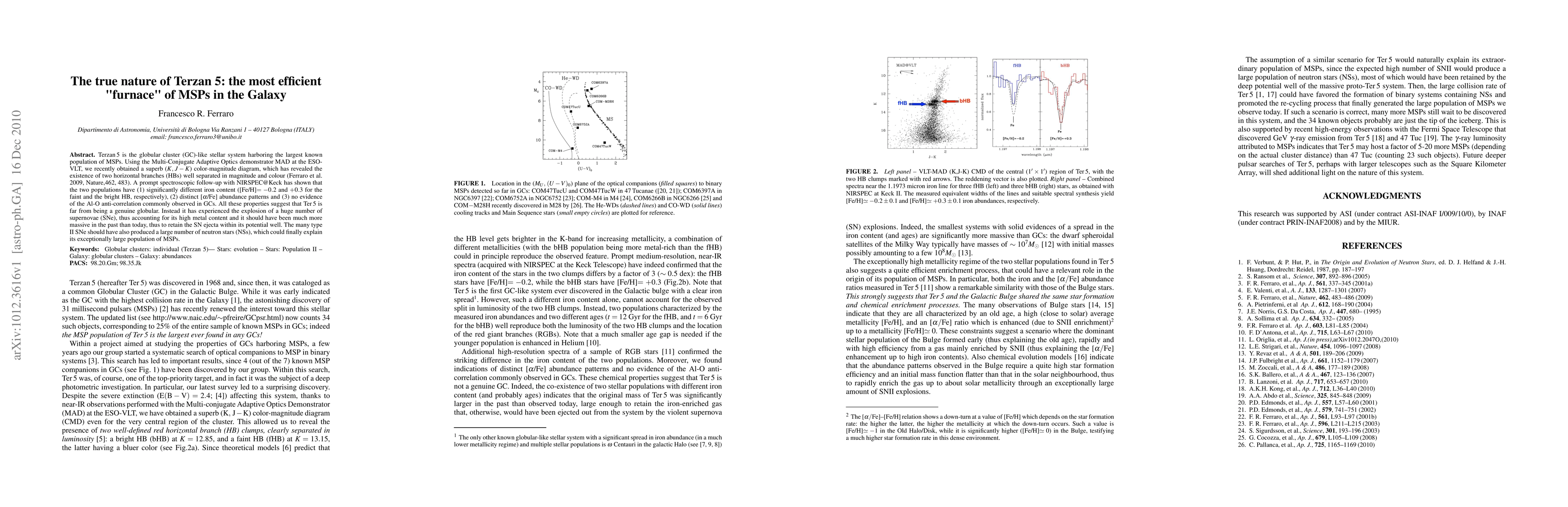 Terzan5 is the globular cluster (GC)-like stellar system harboring the largest known population of MSPs. Using the Multi-Conjugate Adaptive Optics demonstrator MAD at the ESO - VLT, we recently obtained a superb (K, J - K) color-magnitude diagram, which has revealed the existence of two horizontal branches (HBs) well separated in magnitude and colour (Ferraro et al. 2009, Nature,462, 483). A prompt spectroscopic follow-up with NIRSPEC@Keck has shown that the two populations have (1) significantly different iron content ([Fe/H]= -0.2 and +0.3 for the faint and the bright HB, respectively), (2) distinct [alpha/Fe] abundance patterns and (3) no evidence of the Al-O anti-correlation commonly observed in GCs. All these properties suggest that Ter 5 is far from being a genuine globular. Instead it has experienced the explosion of a huge number of supernovae (SNe), thus accounting for its high metal content and it should have been much more massive in the past than today, thus to retain the SN ejecta within its potential well. The many type II SNe should have also produced a large number of neutron stars (NSs), which could finally explain its exceptionally large population of MSPs.