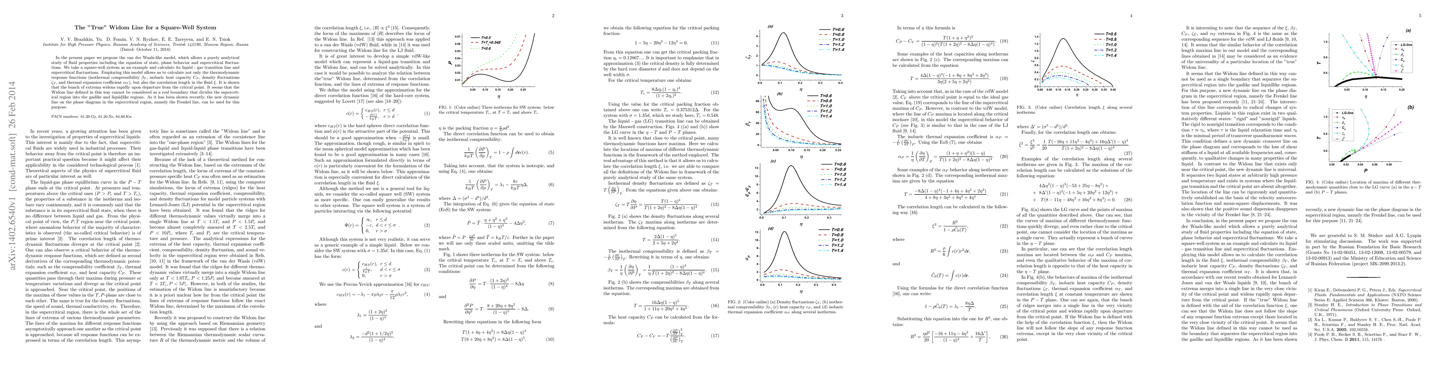 In the present paper we propose the van der Waals-like model, which allows a purely analytical study of fluid properties including the equation of state, phase behavior and supercritical fluctuations. We take a square-well system as an example and calculate its liquid - gas transition line and supercritical fluctuations. Employing this model allows us to calculate not only the thermodynamic response functions (isothermal compressibility $\beta_T$, isobaric heat capacity $C_P$, density fluctuations $\zeta_T$, and thermal expansion coefficient $\alpha_T$), but also the correlation length in the fluid $\xi$. It is shown that the bunch of extrema widens rapidly upon departure from the critical point. It seems that the Widom line defined in this way cannot be considered as a real boundary that divides the supercritical region into the gaslike and liquidlike regions. As it has been shown recently, the new dynamic line on the phase diagram in the supercritical region, namely the Frenkel line, can be used for this purpose.