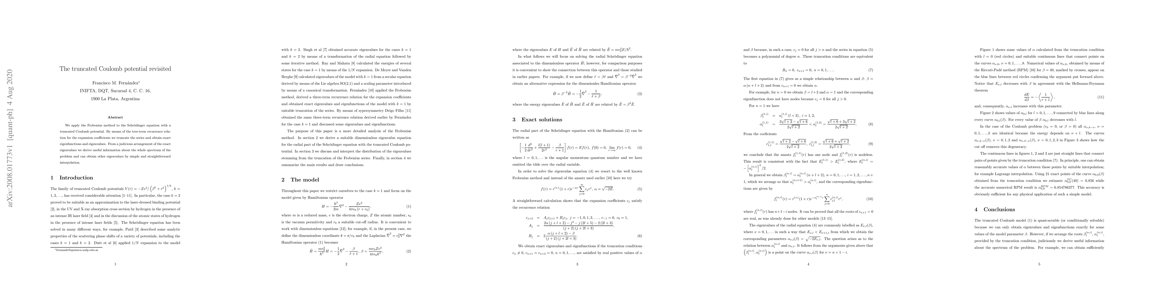 Researchers applied the Frobenius method to a truncated Coulomb potential, obtaining exact eigenfunctions and eigenvalues through a tree-term recurrence relation, allowing for interpolation of other eigenvalues.