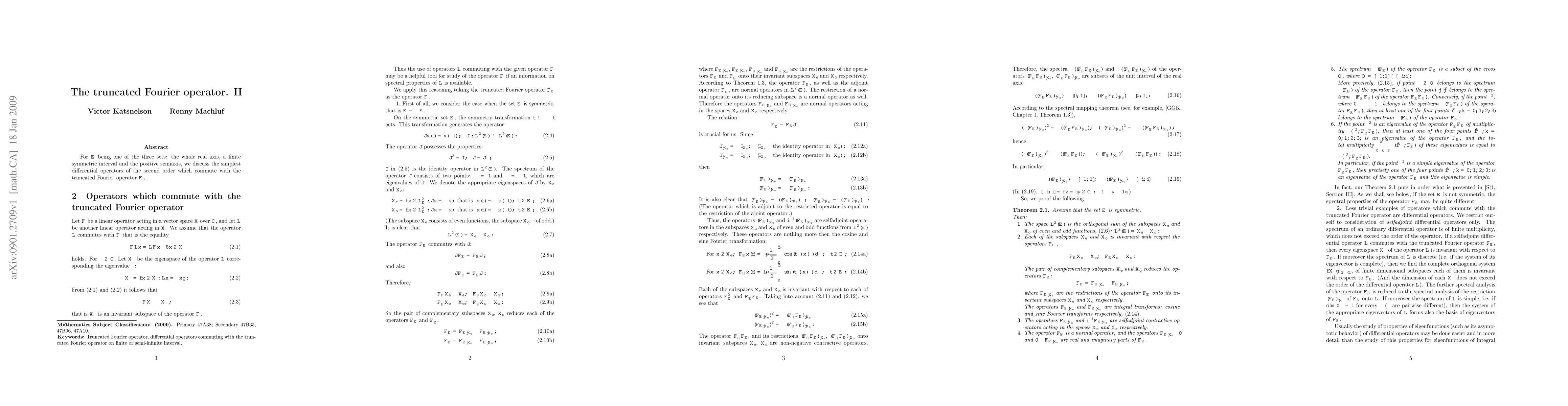 Summary: This paper explores second-order differential operators that commute with the truncated Fourier operator (\mathscr{F}_E) for three different domains: the entire real line, a finite symmetric interval, and the positive semiaxis. The focus is on identifying the simplest such operators.