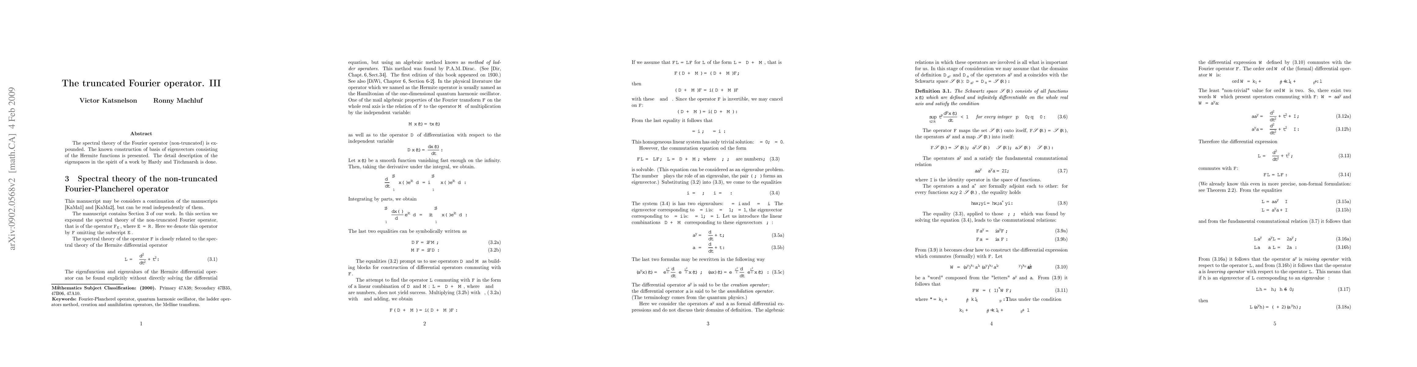 The spectral theory of the Fourier operator (non-truncated) is expounded. The known construction of basis of eigenvectors consisting of the Hermite functions is presented. The detail description of the eigenspaces in the spirit of a work by Hardy and Titchmarsh is done.