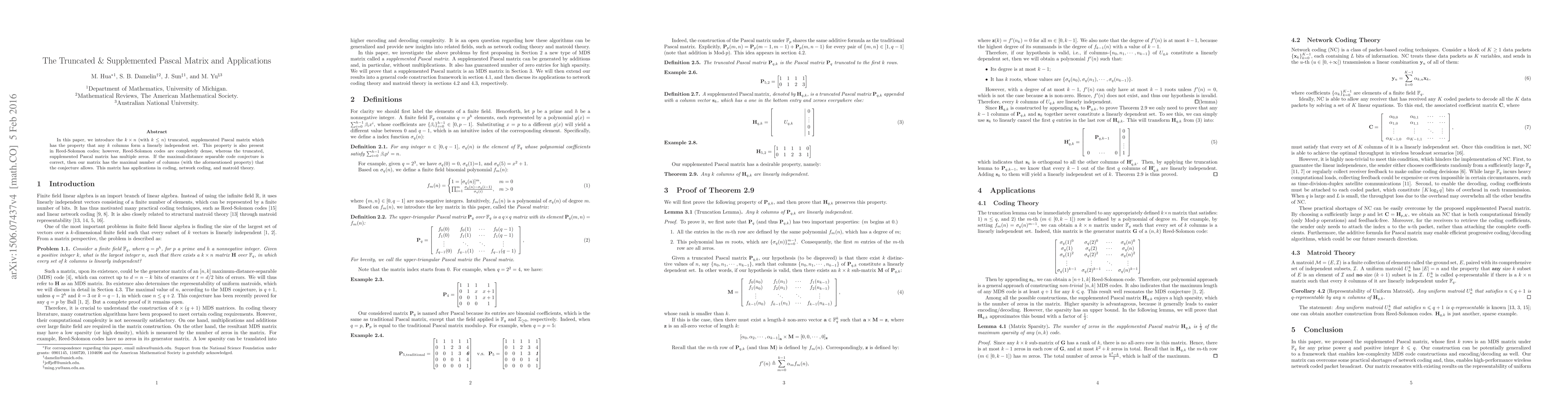 This paper introduces the $k\times n$ truncated, supplemented Pascal matrix, which maintains linear independence among any $k$ columns, contrasting with the dense nature of Reed-Solomon codes. The matrix has potential applications in coding, network coding, and matroid theory, and may support the maximal-distance separable code conjecture.
