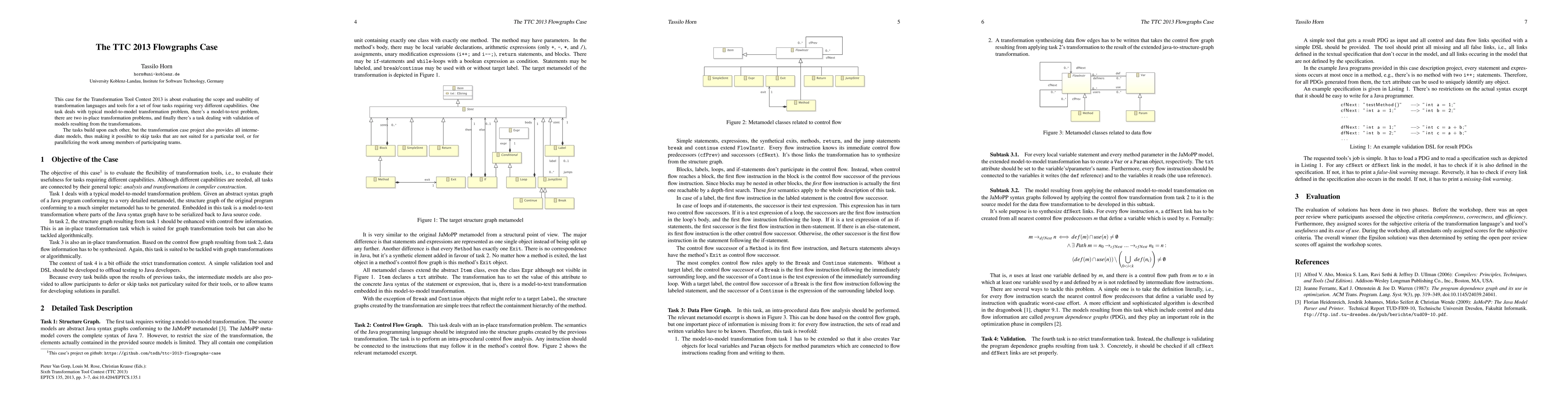 This case for the Transformation Tool Contest 2013 is about evaluating the scope and usability of transformation languages and tools for a set of four tasks requiring very different capabilities. One task deals with typical model-to-model transformation problem, there's a model-to-text problem, there are two in-place transformation problems, and finally there's a task dealing with validation of models resulting from the transformations. The tasks build upon each other, but the transformation case project also provides all intermediate models, thus making it possible to skip tasks that are not suited for a particular tool, or for parallelizing the work among members of participating teams.