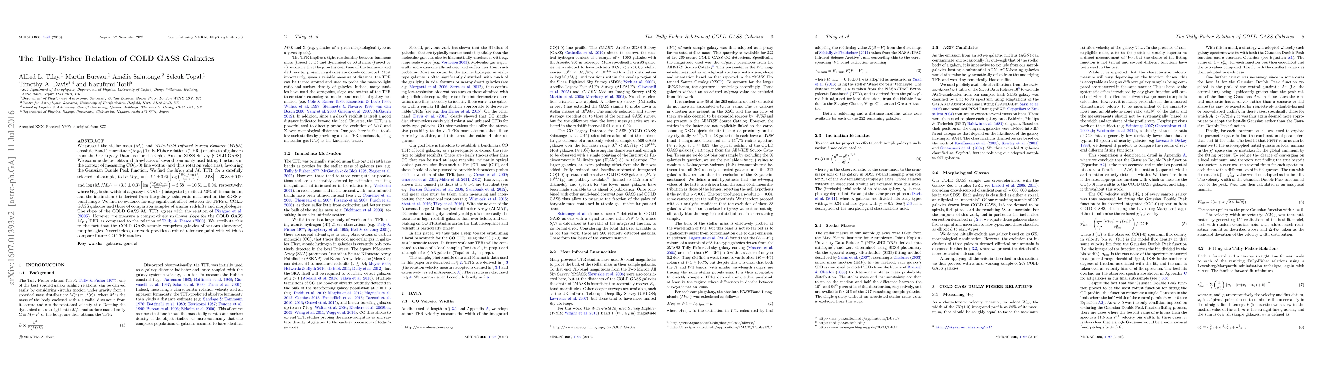 We present the stellar mass (M_*) and Wide-Field Infrared Survey Explorer (WISE) absolute Band 1 magnitude (M_W1) Tully-Fisher relations (TFRs) of subsets of galaxies from the CO Legacy Database for the Galex Arecibo SDSS Survey (COLD GASS). We examine the benefits and drawbacks of several commonly used fitting functions in the context of measuring CO(1-0) line widths (and thus rotation velocities), favouring the Gaussian Double Peak function. We find the M_W1 and M_* TFR, for a carefully selected sub-sample, to be M_W1 = (-7.1 +/- 0.6) [log(W_50/sin i) - 2.58] - 23.83 +/- 0.09 and log(M_*/M_Sun) = (3.3 +/- 0.3) [log(W_50/sin i) - 2.58] + 10.51 +/- 0.04, respectively, where W_50 is the width of a galaxy's CO(1-0) integrated profile at 50% of its maximum and the inclination i is derived from the galaxy axial ratio measured on the SDSS r-band image. We find no evidence for any significant offset between the TFRs of COLD GASS galaxies and those of comparison samples of similar redshifts and morphologies. The slope of the COLD GASS M_* TFR agrees with the relation of Pizagno et al. (2005). However, we measure a comparatively shallower slope for the COLD GASS M_W1 TFR as compared to the relation of Tully & Pierce (2000). We attribute this to the fact that the COLD GASS sample comprises galaxies of various (late-type) morphologies. Nevertheless, our work provides a robust reference point with which to compare future CO TFR studies.