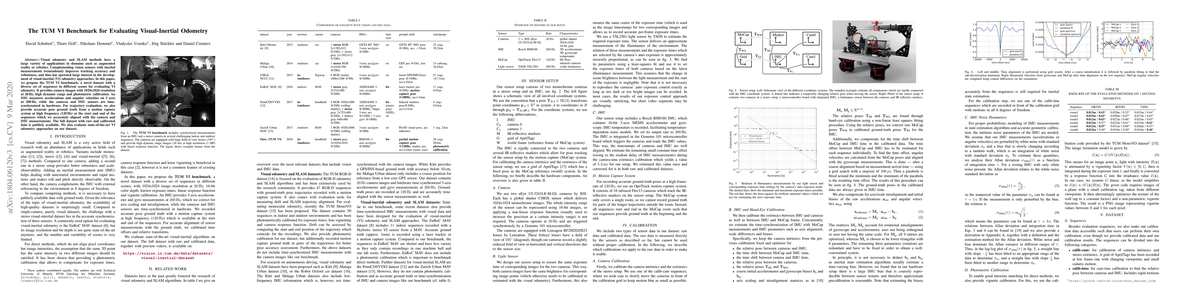 The paper presents the TUM VI Benchmark, a novel dataset for evaluating visual-inertial odometry (VI) approaches. It includes high-resolution images (1024x1024 at 20 Hz), high dynamic range, photometric calibration, and synchronized IMU measurements (200 Hz, 3-axis accelerometer and gyroscope). Ground truth poses from a motion capture system (120 Hz) are provided at the start and end of sequences, accurately aligned with camera and IMU measurements.