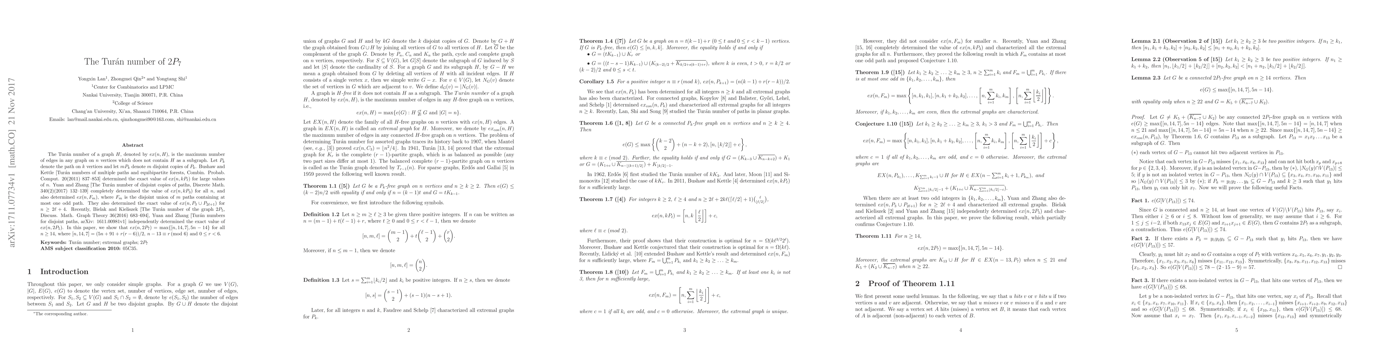Researchers have determined the Turan number for 2P_7, a specific graph type, to be between max{n,14,7} and 5n-14 for all n >= 14.