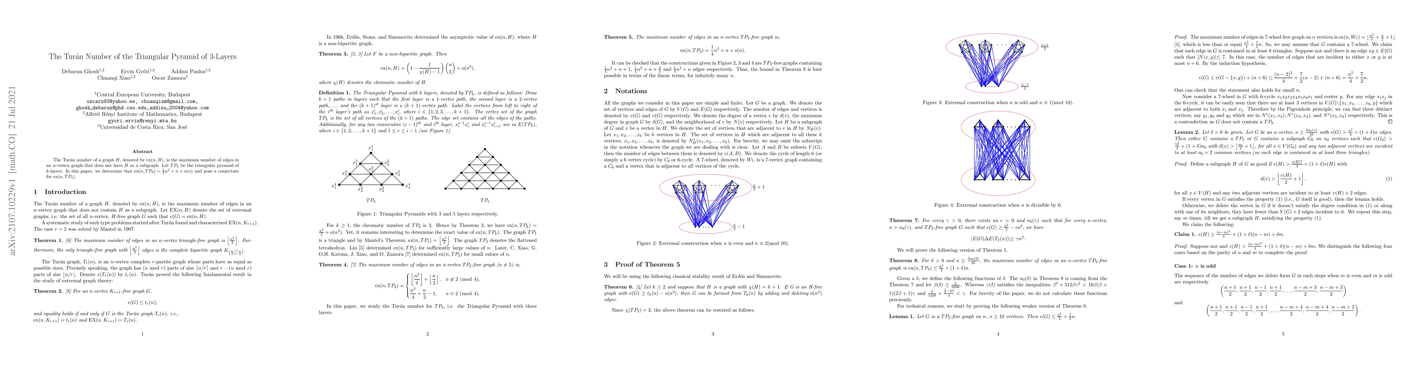 The Tur\'an number of a graph $H$, denoted by $\text{ex}(n, H)$, is the maximum number of edges in an $n$-vertex graph that does not have $H$ as a subgraph. Let $TP_k$ be the triangular pyramid of $k$-layers. In this paper, we determine that $\text{ex}(n,TP_3)= \frac{1}{4}n^2+n+o(n)$ and pose a conjecture for $\text{ex}(n,TP_4)$.