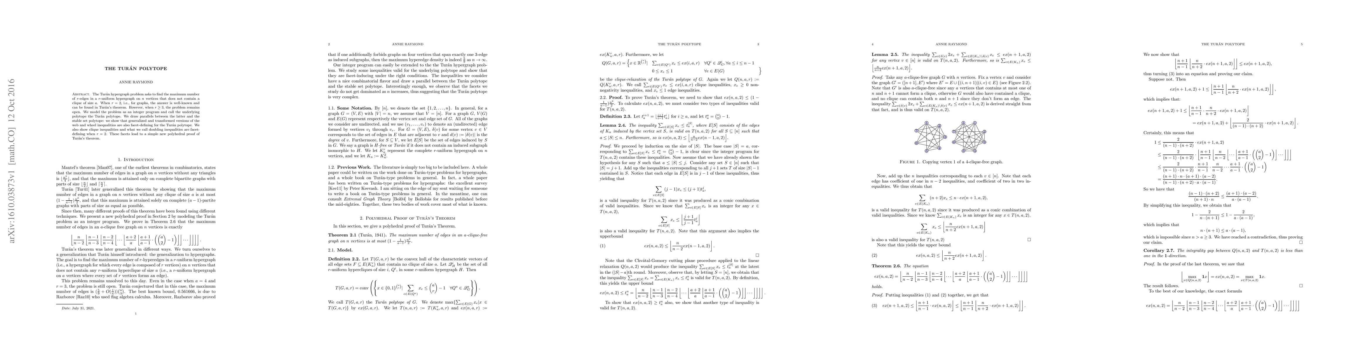 The Tur\'an hypergraph problem asks to find the maximum number of $r$-edges in a $r$-uniform hypergraph on $n$ vertices that does not contain a clique of size $a$. When $r=2$, i.e., for graphs, the answer is well-known and can be found in Tur\'an's theorem. However, when $r\geq 3$, the problem remains open. We model the problem as an integer program and call the underlying polytope the Tur\'an polytope. We draw parallels between the latter and the stable set polytope: we show that generalized and transformed versions of the web and wheel inequalities are also facet-defining for the Tur\'an polytope. We also show clique inequalities and what we call doubling inequalities are facet-defining when $r=2$. These facets lead to a simple new polyhedral proof of Tur\'an's theorem.
