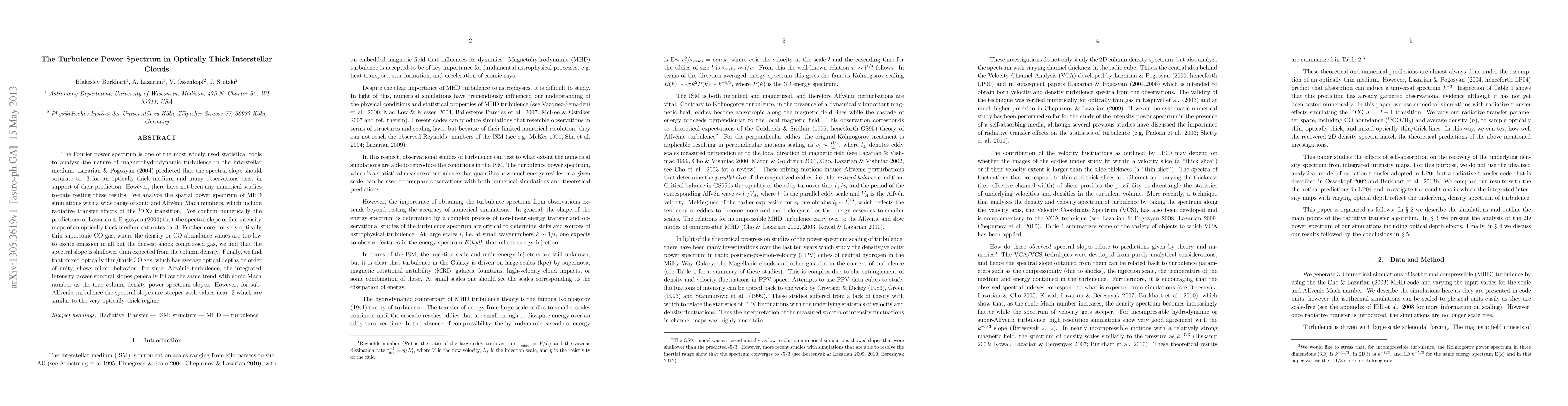 This paper confirms numerically that the spectral slope of magnetohydrodynamic turbulence in optically thick interstellar clouds saturates to -3, as predicted by Lazarian & Pogosyan (2004). It also finds that for optically thin CO gas, the spectral slope is shallower than expected, while mixed optically thin/thick CO gas exhibits varied behavior depending on turbulence type.