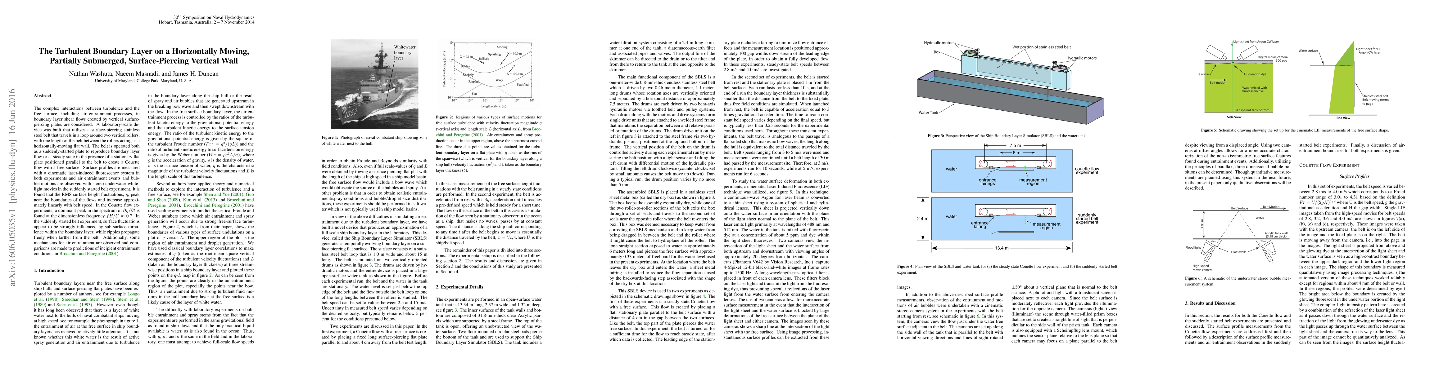 This study investigates turbulence and air entrainment in boundary layer flows generated by a horizontally moving, partially submerged surface-piercing vertical wall using a laboratory setup. Results show that surface height fluctuations peak near the flow boundaries and increase linearly with belt speed, while sub-surface turbulence significantly influences surface fluctuations.