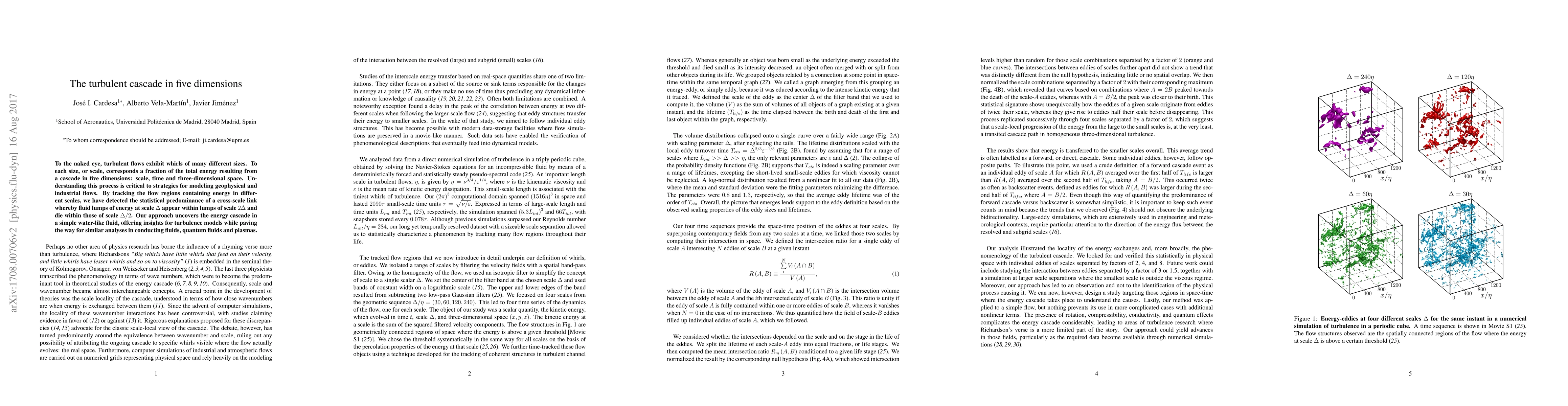 This paper investigates the turbulent cascade in five dimensions, revealing a statistical pattern where energy lumps at scale $\Delta$ emerge within lumps of scale $2\Delta$ and dissipate within those of scale $\Delta/2$. This insight into the energy distribution across different scales enhances turbulence modeling for geophysical and industrial flows.