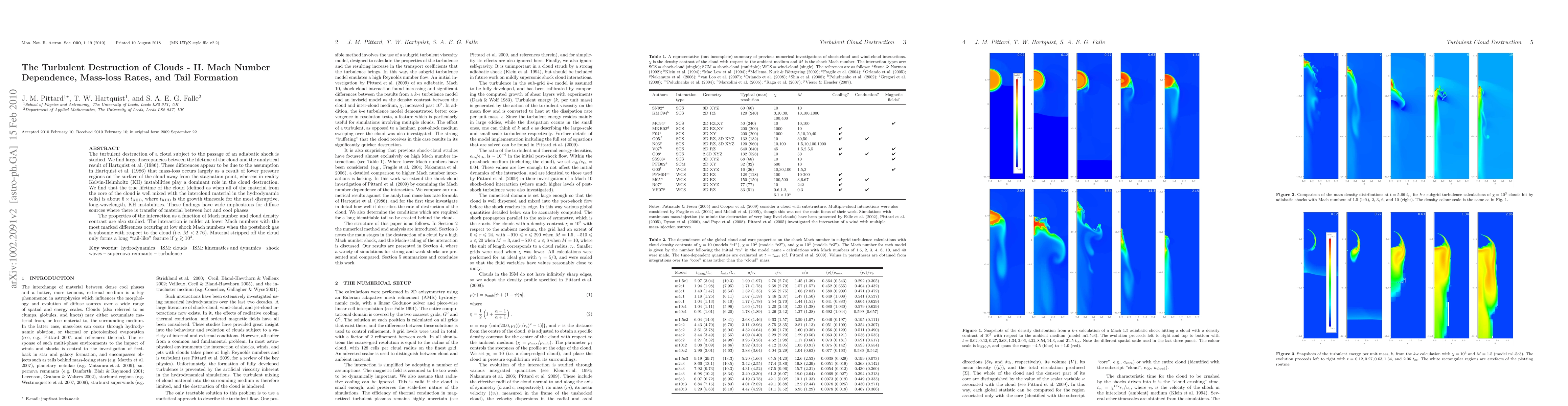 The turbulent destruction of a cloud subject to the passage of an adiabatic shock is studied. We find large discrepancies between the lifetime of the cloud and the analytical result of Hartquist et al. (1986). These differences appear to be due to the assumption in Hartquist et al. that mass-loss occurs largely as a result of lower pressure regions on the surface of the cloud away from the stagnation point, whereas in reality Kelvin-Helmholtz (KH) instabilities play a dominant role in the cloud destruction. We find that the true lifetime of the cloud (defined as when all of the material from the core of the cloud is well mixed with the intercloud material in the hydrodynamic cells) is about 6 times t_KHD, where t_KHD is the growth timescale for the most disruptive, long-wavelength, KH instabilities. These findings have wide implications for diffuse sources where there is transfer of material between hot and cool phases. The properties of the interaction as a function of Mach number and cloud density contrast are also studied. The interaction is milder at lower Mach numbers with the most marked differences occuring at low shock Mach numbers when the postshock gas is subsonic with respect to the cloud (i.e. M < 2.76). Material stripped off the cloud only forms a long "tail-like" feature if the density contrast of the cloud to the ambient medium, chi > 1e3.