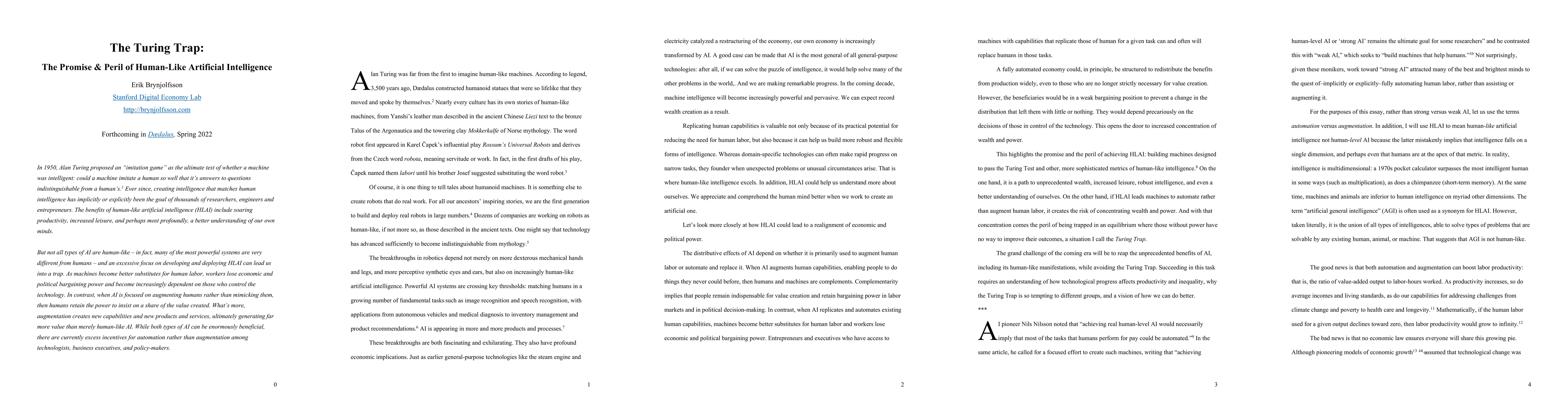 In 1950, Alan Turing proposed an imitation game as the ultimate test of whether a machine was intelligent: could a machine imitate a human so well that its answers to questions indistinguishable from a human. Ever since, creating intelligence that matches human intelligence has implicitly or explicitly been the goal of thousands of researchers, engineers, and entrepreneurs. The benefits of human-like artificial intelligence (HLAI) include soaring productivity, increased leisure, and perhaps most profoundly, a better understanding of our own minds. But not all types of AI are human-like. In fact, many of the most powerful systems are very different from humans. So an excessive focus on developing and deploying HLAI can lead us into a trap. As machines become better substitutes for human labor, workers lose economic and political bargaining power and become increasingly dependent on those who control the technology. In contrast, when AI is focused on augmenting humans rather than mimicking them, then humans retain the power to insist on a share of the value created. Furthermore, augmentation creates new capabilities and new products and services, ultimately generating far more value than merely human-like AI. While both types of AI can be enormously beneficial, there are currently excess incentives for automation rather than augmentation among technologists, business executives, and policymakers.