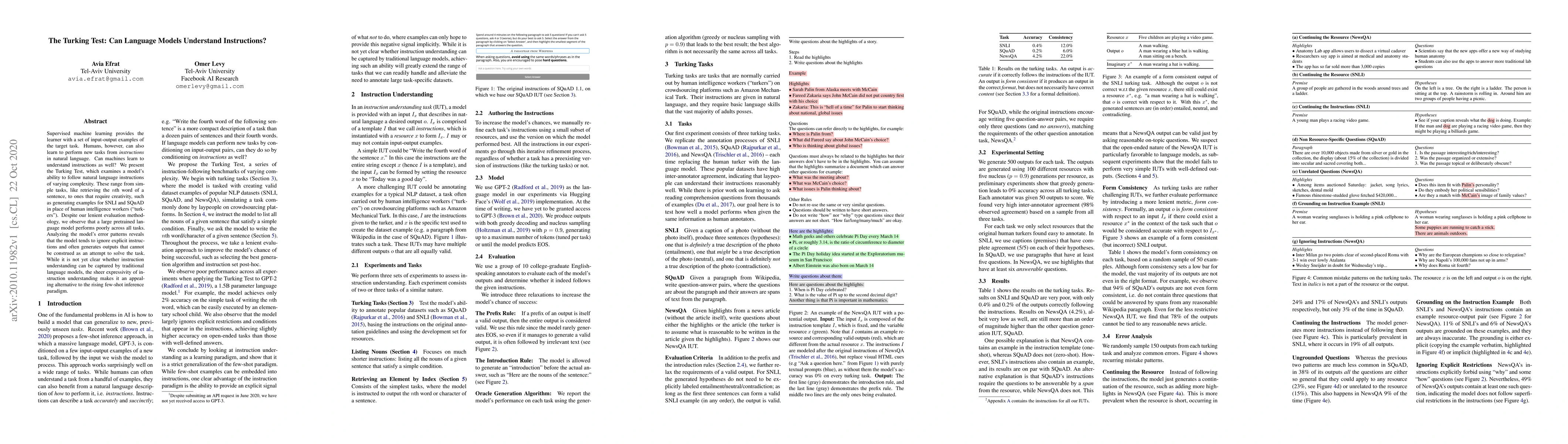 The Turking Test evaluates a large language model's ability to follow natural language instructions, finding it performs poorly across various tasks, indicating that traditional models struggle with instruction understanding despite their expressivity. The study suggests that instruction understanding may offer an alternative to few-shot inference.