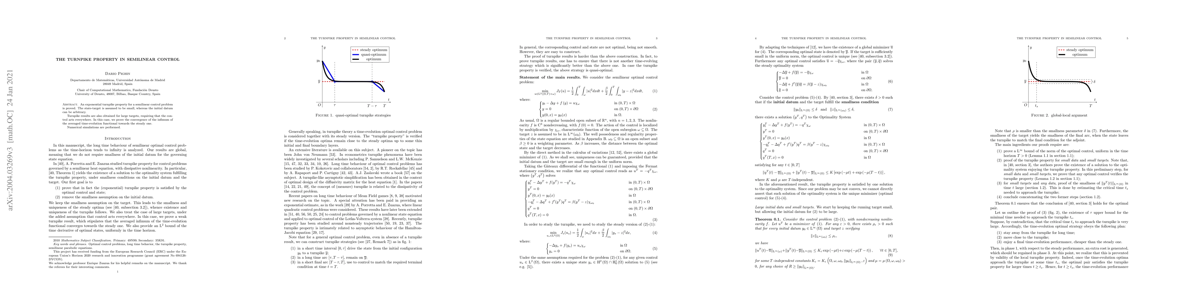 A research paper proves an exponential turnpike property for semilinear control problems, showing convergence of infimum averaged time-evolution functional to the steady state in both small and large target cases.