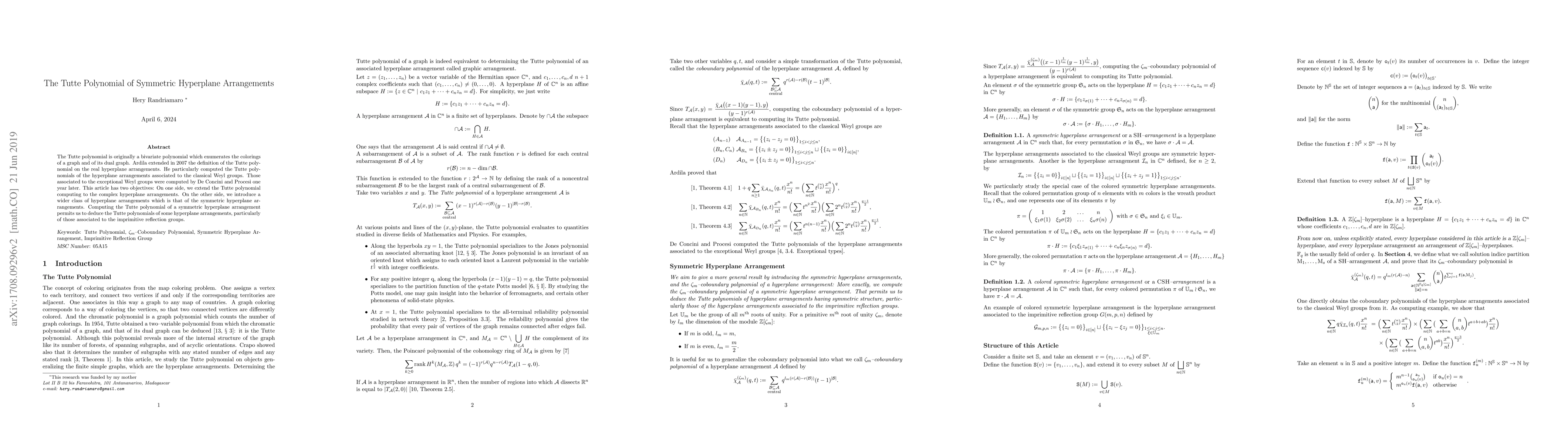 The Tutte polynomial is originally a bivariate polynomial which enumerates the colorings of a graph and of its dual graph. Ardila extended in 2007 the definition of the Tutte polynomial on the real hyperplane arrangements. He particularly computed the Tutte polynomials of the hyperplane arrangements associated to the classical Weyl groups. Those associated to the exceptional Weyl groups were computed by De Concini and Procesi one year later. This article has two objectives: On one side, we extend the Tutte polynomial computing to the complex hyperplane arrangements. On the other side, we introduce a wider class of hyperplane arrangements which is that of the symmetric hyperplane arrangements. Computing the Tutte polynomial of a symmetric hyperplane arrangement permits us to deduce the Tutte polynomials of some hyperplane arrangements, particularly of those associated to the imprimitive reflection groups.