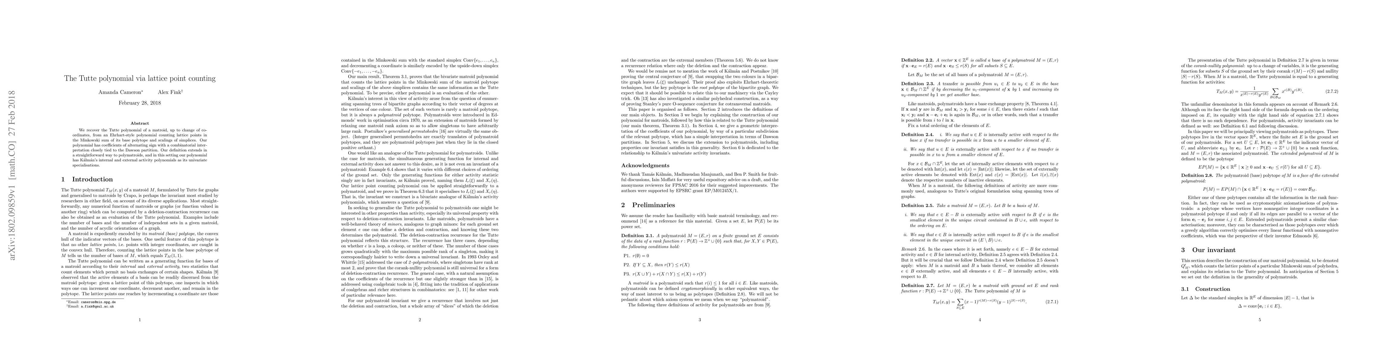 We recover the Tutte polynomial of a matroid, up to change of coordinates, from an Ehrhart-style polynomial counting lattice points in the Minkowski sum of its base polytope and scalings of simplices. Our polynomial has coefficients of alternating sign with a combinatorial interpretation closely tied to the Dawson partition. Our definition extends in a straightforward way to polymatroids, and in this setting our polynomial has K\'alm\'an's internal and external activity polynomials as its univariate specialisations.