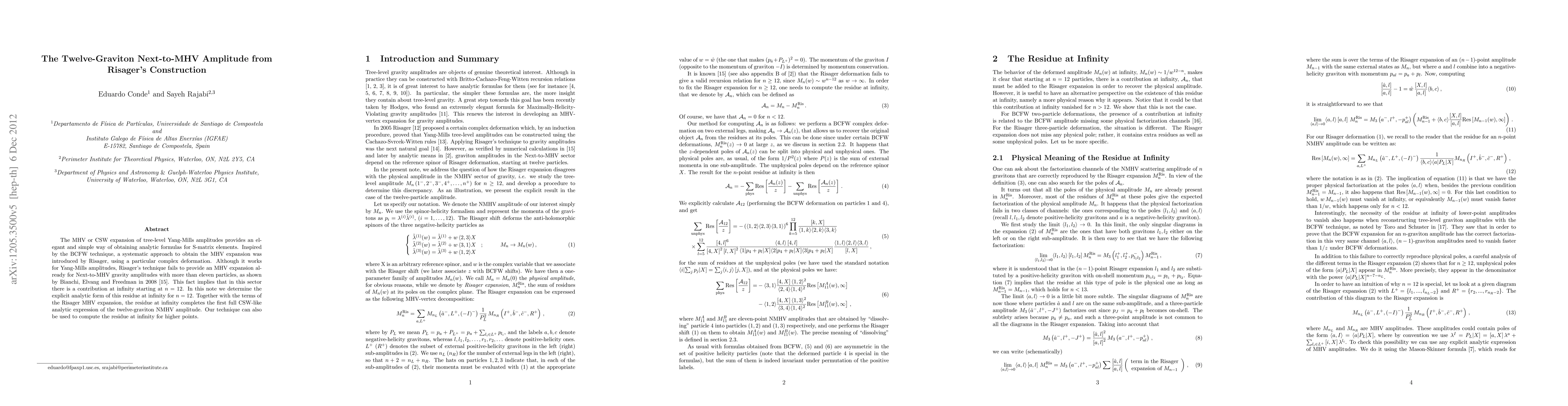 The MHV or CSW expansion of tree-level Yang-Mills amplitudes provides an elegant and simple way of obtaining analytic formulas for S-matrix elements. Inspired by the BCFW technique, a systematic approach to obtain the MHV expansion was introduced by Risager, using a particular complex deformation. Although it works for Yang-Mills amplitudes, Risager's technique fails to provide an MHV expansion already for Next-to-MHV gravity amplitudes with more than eleven particles, as shown by Bianchi, Elvang and Freedman in 2008. This fact implies that in this sector there is a contribution at infinity starting at n = 12. In this note we determine the explicit analytic form of this residue at infinity for n = 12. Together with the terms of the Risager MHV expansion, the residue at infinity completes the first full CSW-like analytic expression of the twelve-graviton NMHV amplitude. Our technique can also be used to compute the residue at infinity for higher points.
