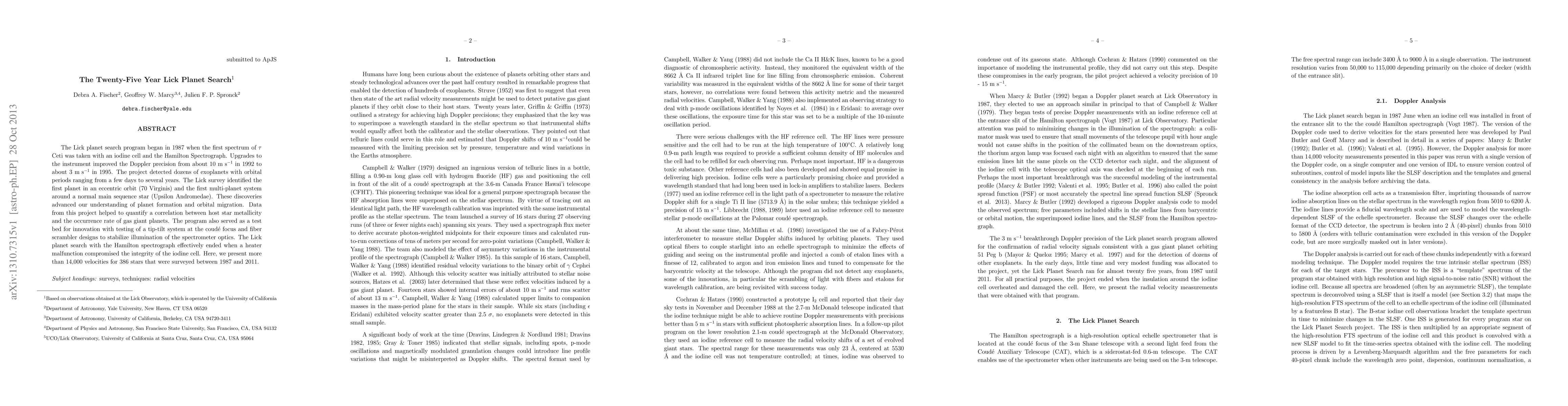 The Lick planet search program utilized the Hamilton Spectrograph with an iodine cell to measure Doppler shifts for 386 nearby stars over 25 years, from 1987 to 2011. The project began with a precision of ~10 m/s, which improved to ~3 m/s by 1995.